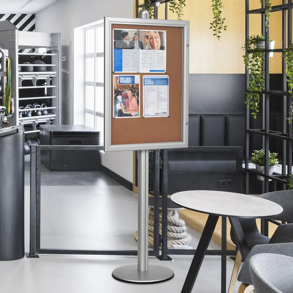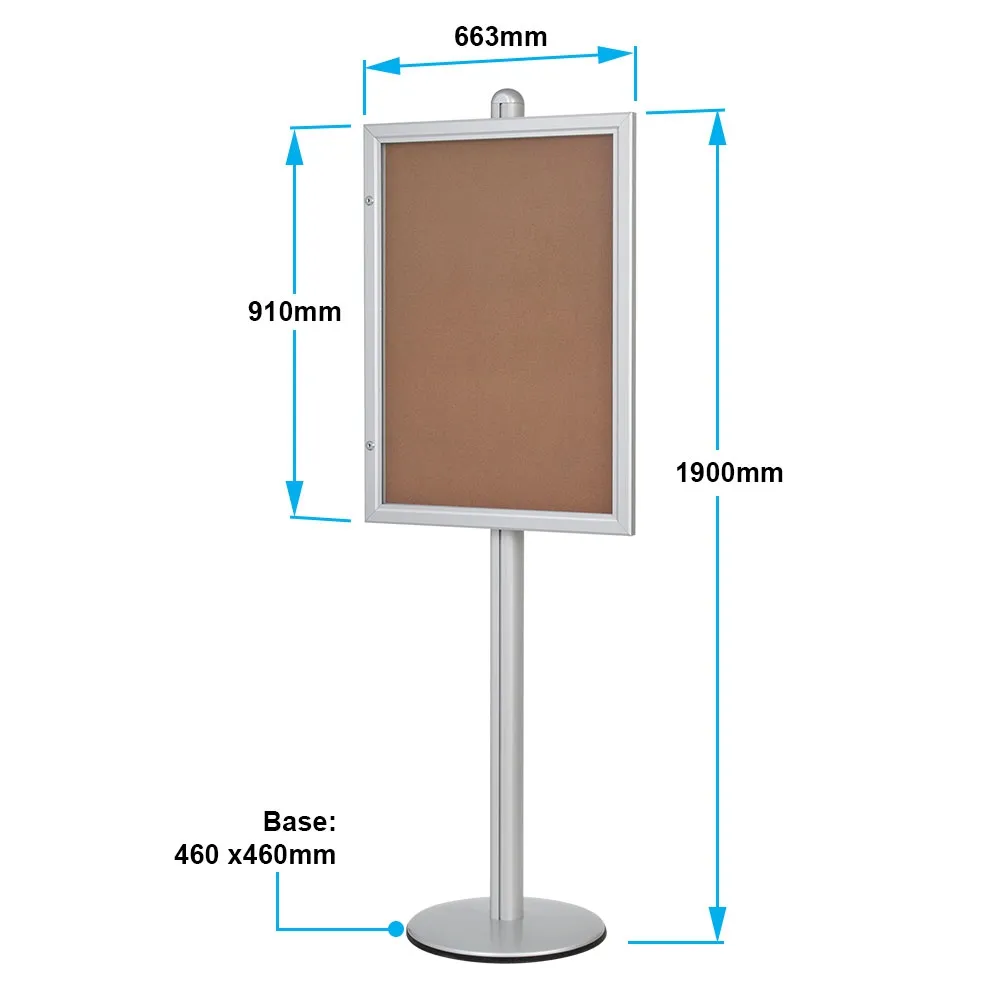 A self-healing corkboard is used to ensure a long-lasting unit that can have items posted using staples, push-pins, and tacks. The display itself is made from aluminium, providing a durable unit that is easily placed into heavily-trafficked locations. The satin silver finish matches any décor with ease, a professional looking display stand that helps to draw passersby attention.