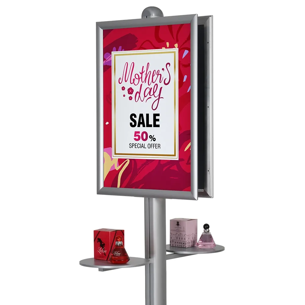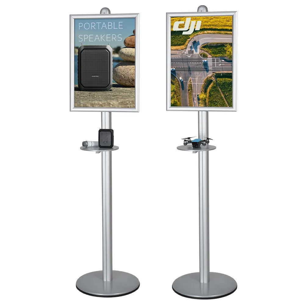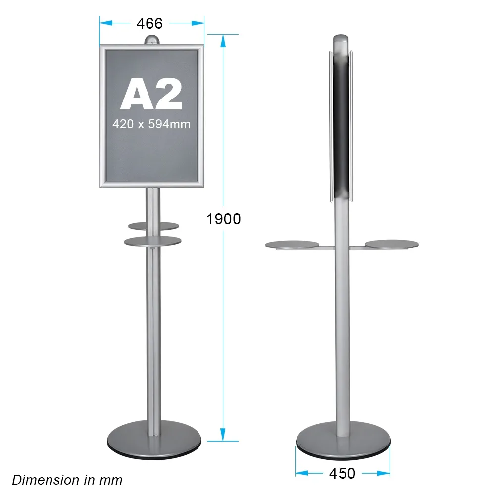 This adjustable pedestal sign holder floor stand, part of our line of modular display stands, features a modular design to allow heaps of accessories to be added for full customisation of the unit. There is a 250mm diameter shelf that is perfect for holding hand sanitiser, anti-bacterial wipes, gels, and even brochure holders to provide take away information to visitors. The modular design of this display allows for heaps of other accessory components to be added including additional poster frames and literature pockets to turn this unit into a full-on information stand or two-sided display!