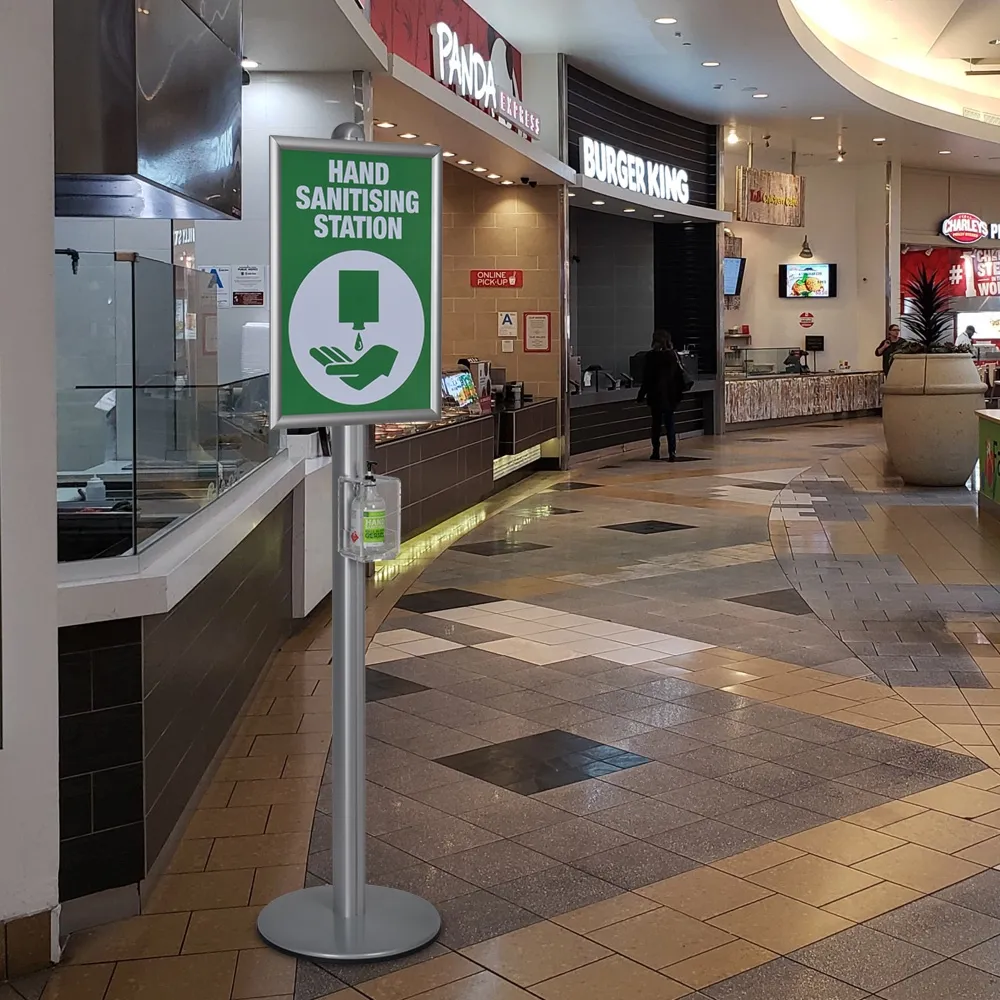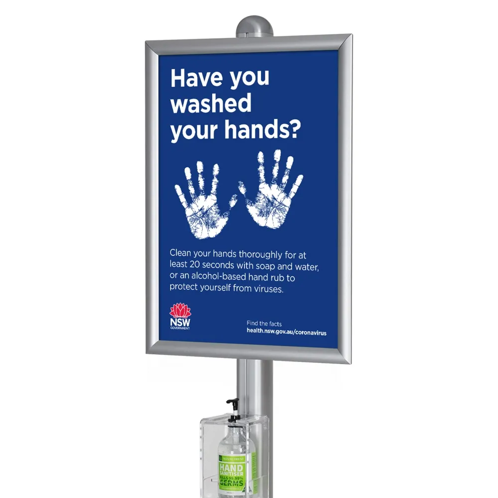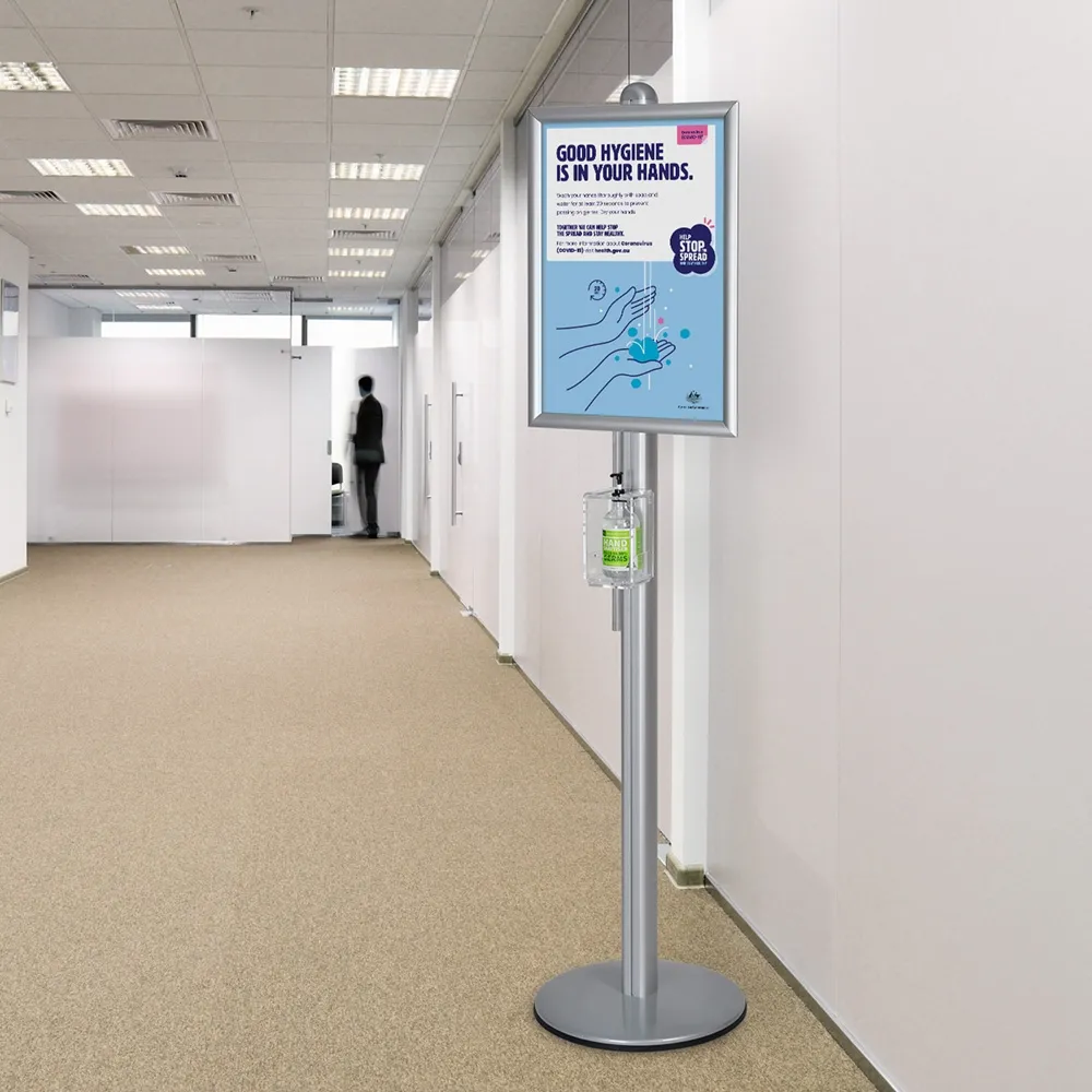 This A2 poster display with secure holder, part of our line of business support essentials, uses a large A2 (420 x 594mm) signage holder for drawing passersby attention and creating awareness of the hand sanitiser station. The snap frame design makes sign changes quick and easy with no tools, and a protective lens helps prevent grime and dust build-up on posters. This entire display has a modular design to allow the components to be placed where desired along the centre pole, with heaps of other accessories also available to customise the fixture for use at your location.
