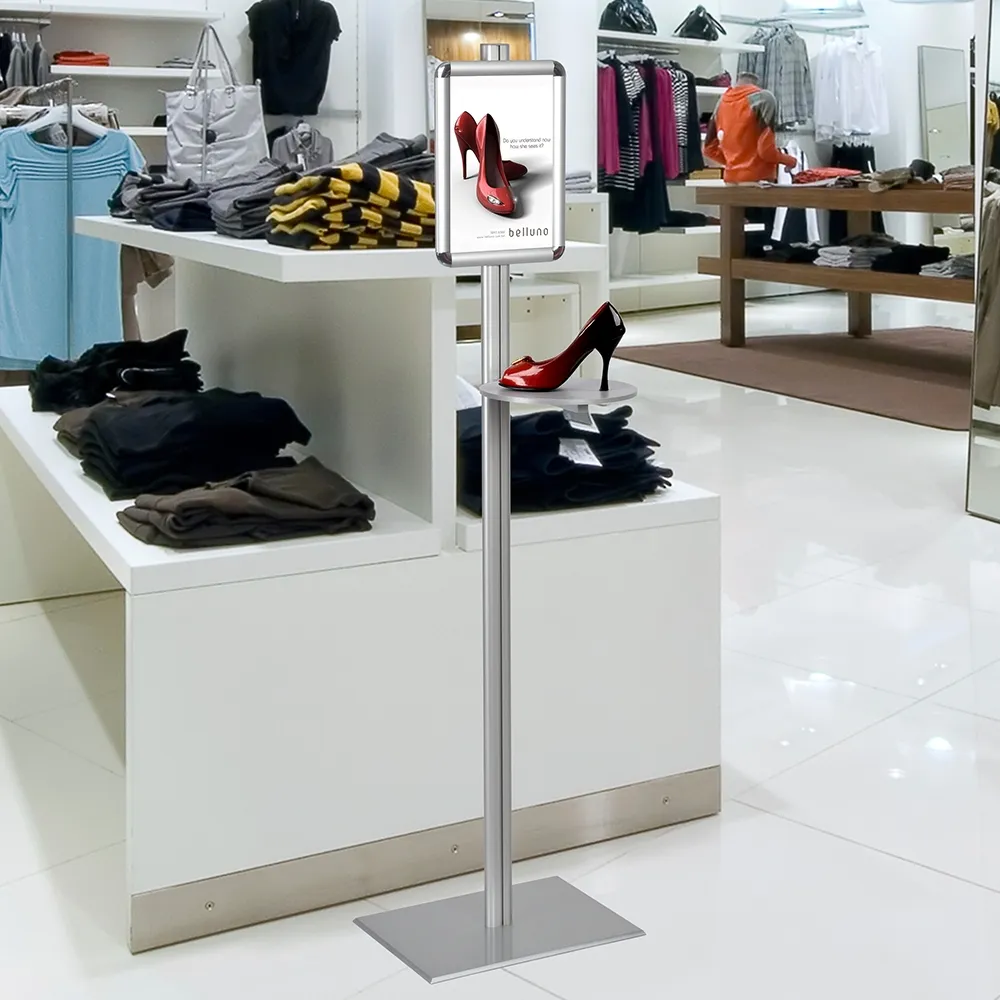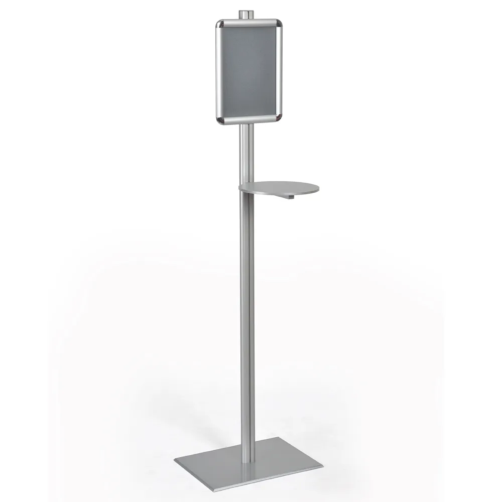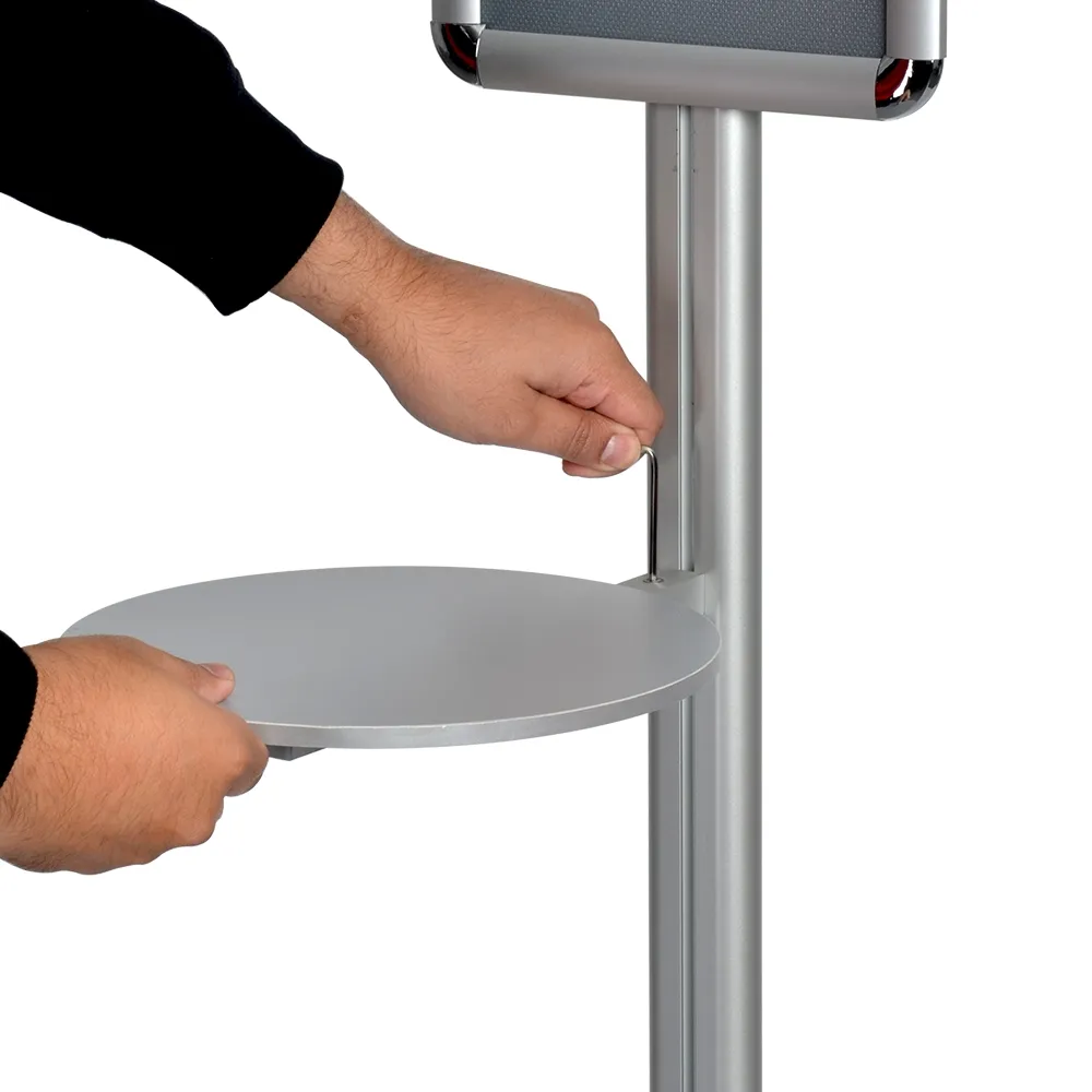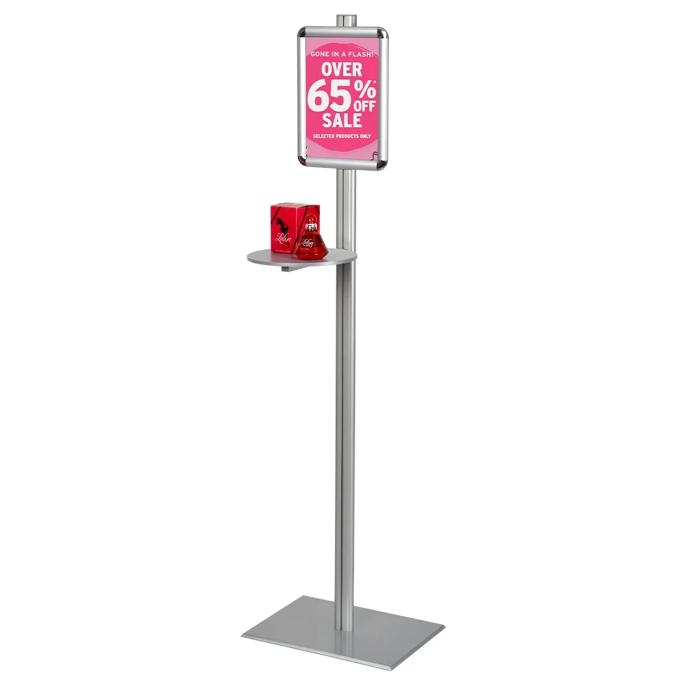 - Free standing poster display includes adjustable height shelf with 250mm diameter