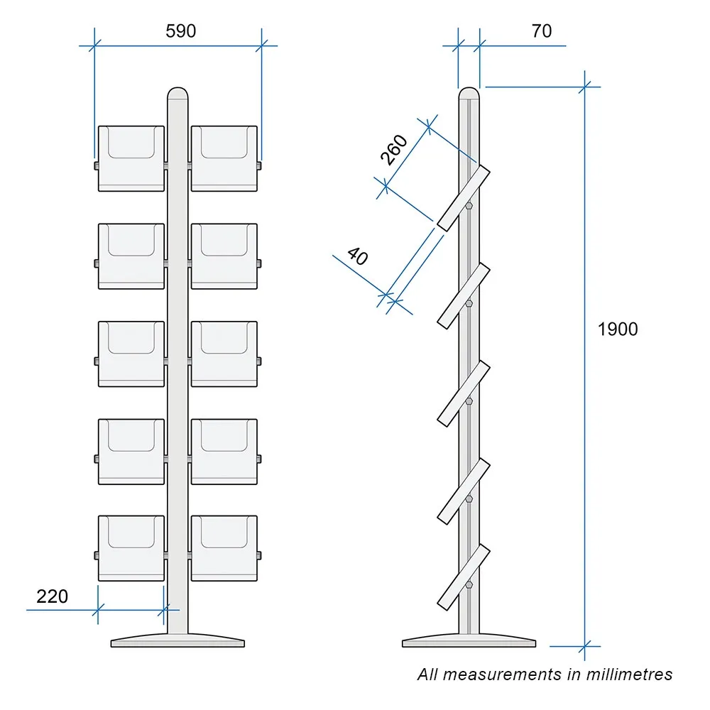 The brochure display stand is 1900mm tall, making it easily recognisable in any location. The silver finish of the catalogue rack blends in with any surrounding. The literature holder, brochure display stand has an anodised aluminium base and centre pole, providing durability for use years to come.