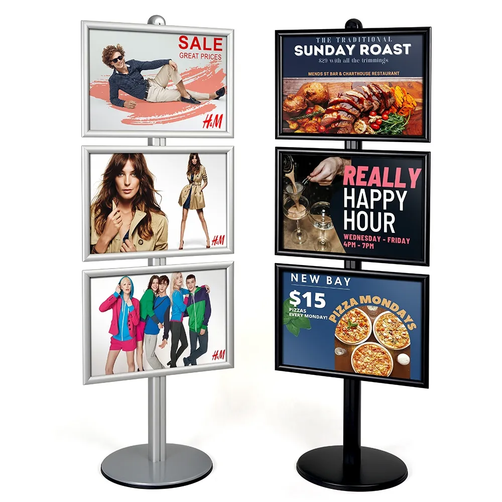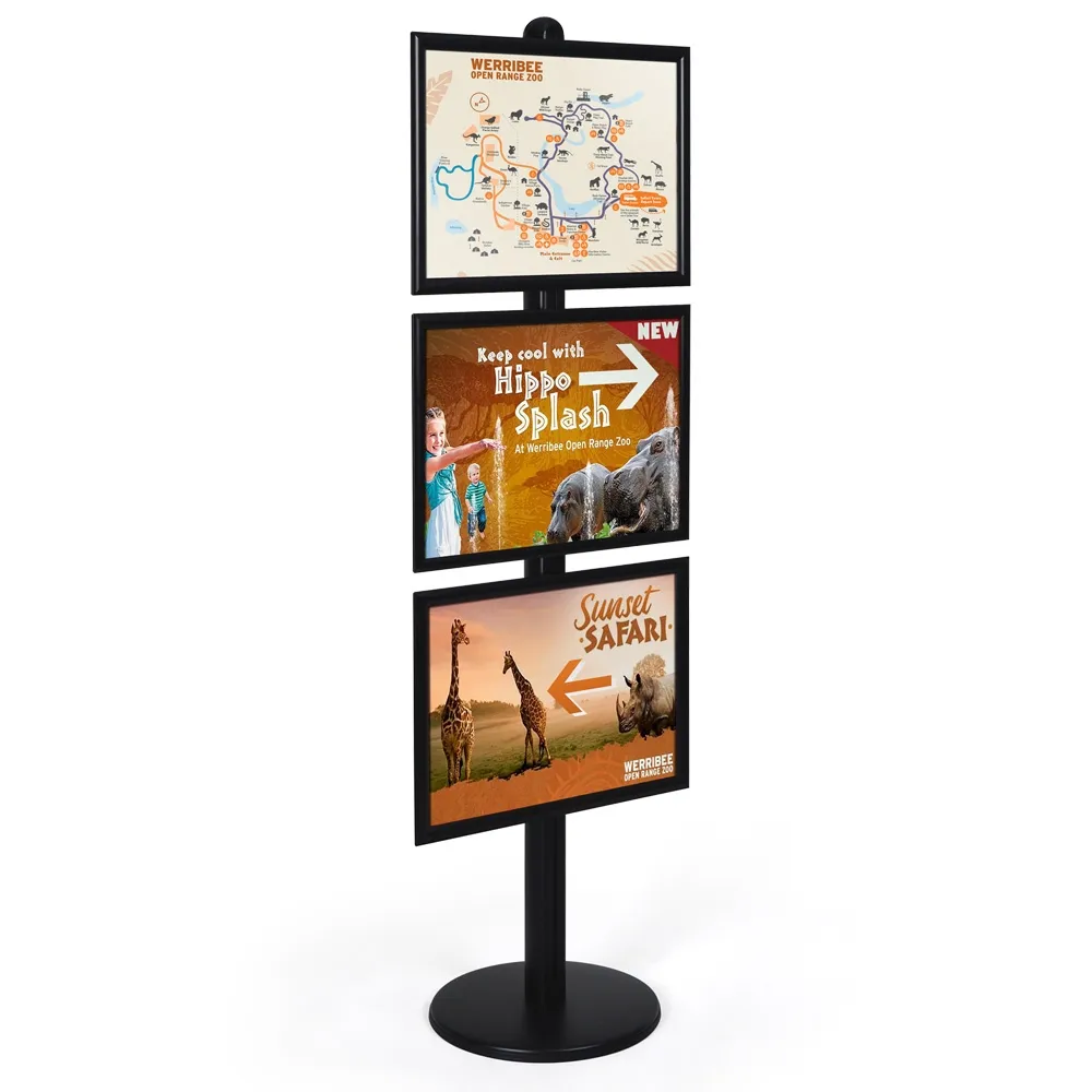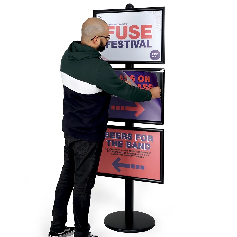 Free standing signs are used to help visitors find their way at conference centres and exhibitions, advertise in retail stores, and welcome guests at hotels and events! The retail display stand has (3) separate clip frames that display A2 (420 x 594mm) standard sized graphics that are in landscape format. Each snap frame makes it easy to change out posters in seconds with no tools required. There is a protective lens included with each clipframe as well that helps prevent grime build up and deters vandalism.