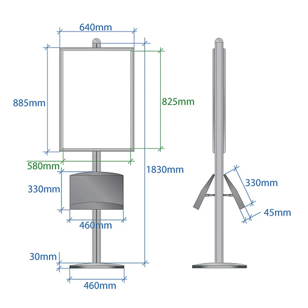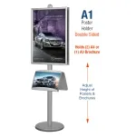 This display stand arrangement has a distinctly high end presentation featuring two silver A1 snap frames and two single pocket brochure holders. The posters sits high on the stand to attract your targets' attention from both directions, while the brochure units draw them in and compliments you advertising with more detailed information about your product or service. It's effective because the customer is left with a 'take home' reminder of your business and product.