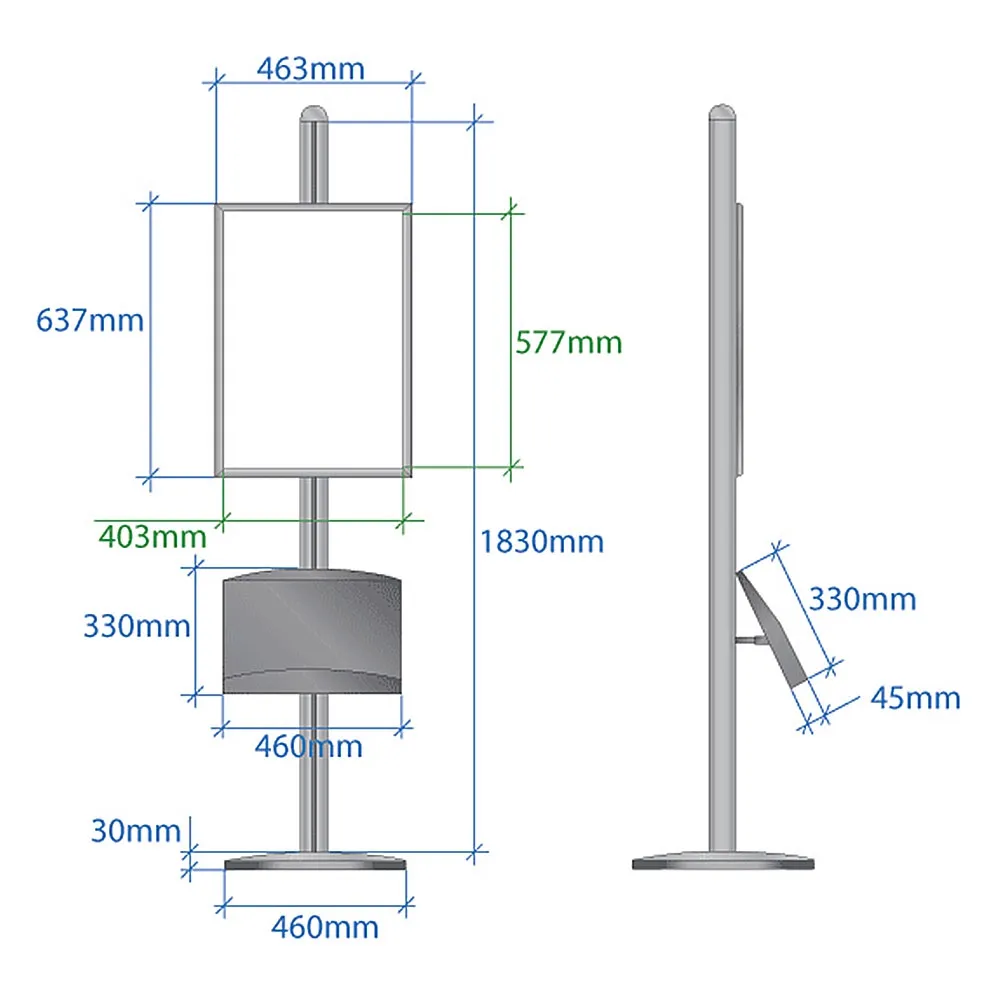 This advertising display, also known as a brochure holder, is used in retail stores, car dealerships, exhibitions centres and more. The advertising display has (2) metal pockets that hold (2) A4 booklets side by side, a single A3 booklet, or even (3) tri-fold A4 brochures. The 460 mm x 330 mm pockets are powder coated to be chip & scratch resistant, and angle up 25° to make reading easier. This advertising display is 1830 mm tall, easily seen in most locations. The base and pole are made from anodised aluminum, making a durable display that will hold up in heavily trafficked areas.