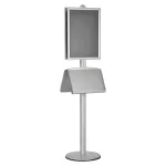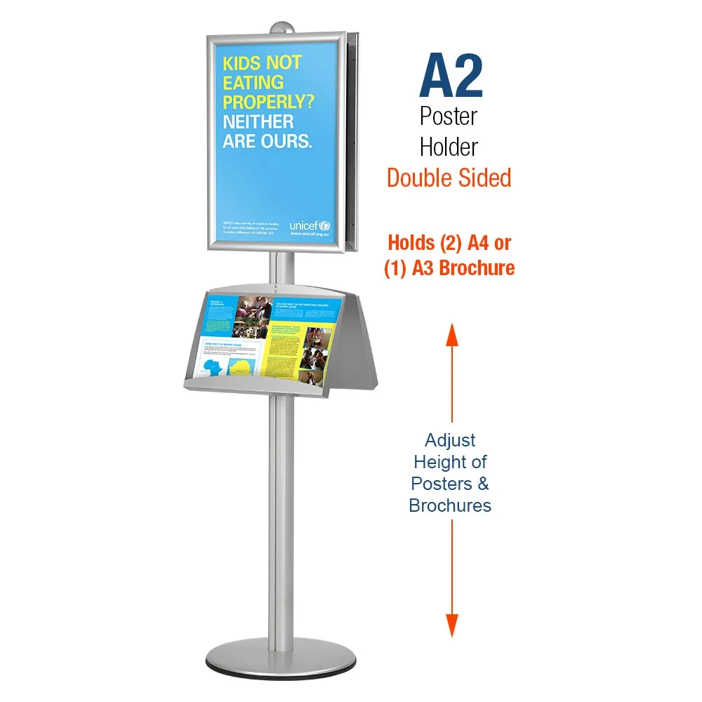 This display stand lends a distinctly high end presentation and attracts more attention and more customers to your business. It features two silver A2 clip frame poster holders and two single pocket brochure or literature holders. The posters sit high on opposing sides of the stand, reaching your audience from both directions, while the brochure units draw them in and compliments you advertising with more detailed information about your product or service. Furthermore, the customer is left with a ‘take home’ reminder of your business and product.