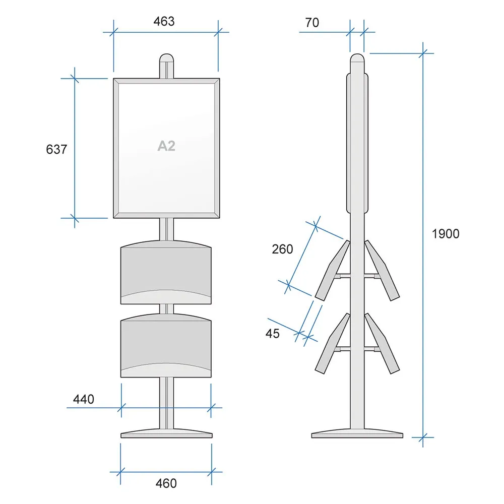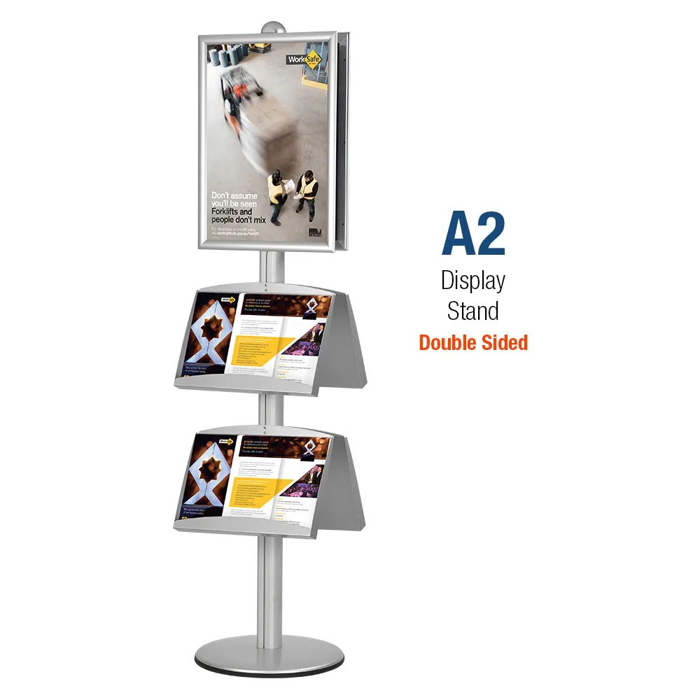 This exhibition literature stand is found in information centres, retail stores, office lobbies, and exhibition centres. The sleek European design of the poster display helps to draw customers towards the unit. The exhibition literature stand has (2) clip frames that hold A2 sized posters. These clip frames include a non-reflective lens that helps prevent graphics from gathering grime and dust.