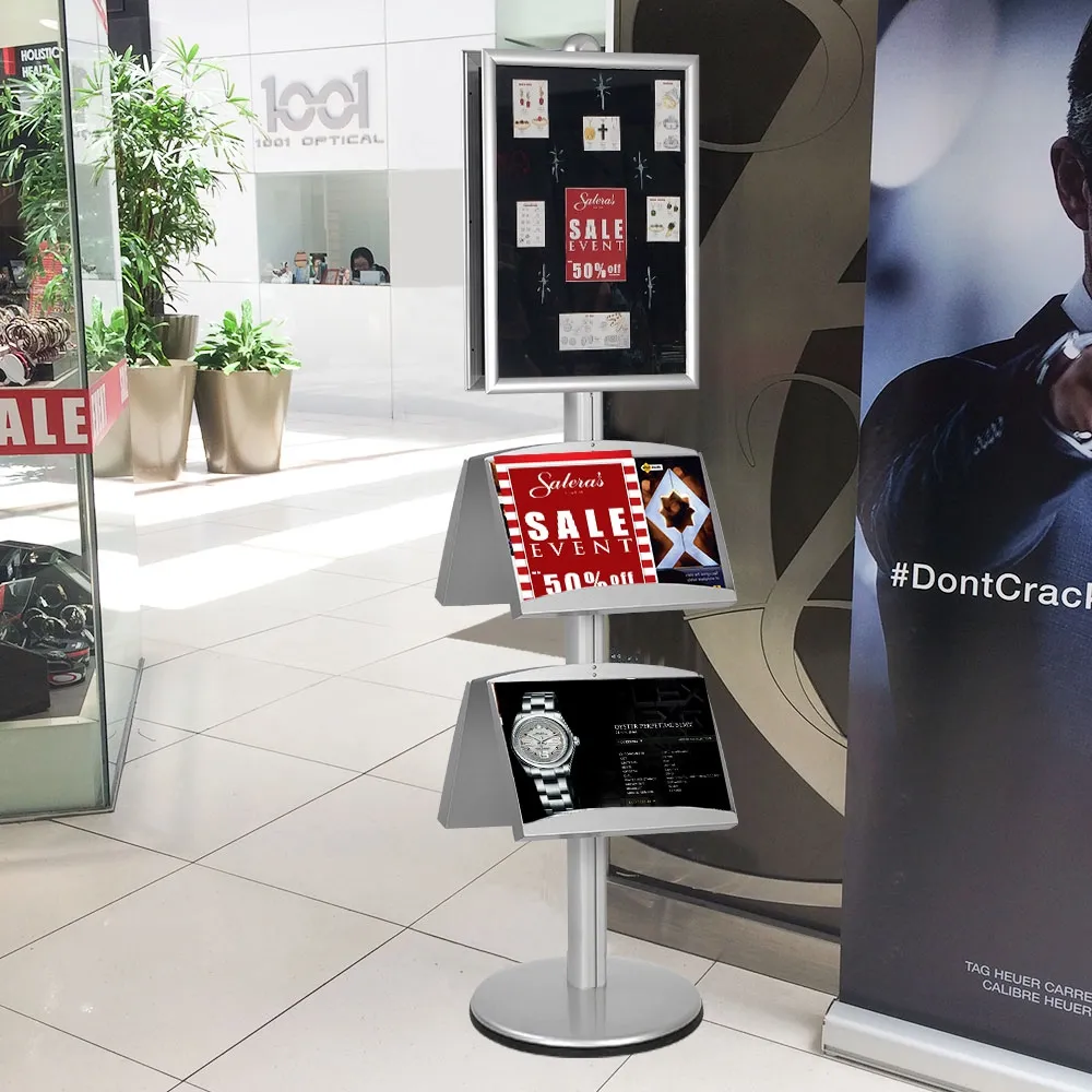 The exhibition literature stand, also known as a retail display, also features (4) brochure pockets. These pockets are powder coated stainless steel, and angled upwards 20°. This exhibition literature stand can fit (2) large format A4 or a single A3 magazine, leaflet, or booklet on each pocket. With so many products, it's easy to provide customers with the information they need regarding your display. The poster display, exhibition literature stand is a modular display, allowing accessories to be left off if not necessary for a particular promotion. The display stands at 1830 mm, easily visible in any room and drawing potential clients to your business.