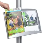 The poster display, exhibition literature stand makes changing out graphics fast and simple. Snap open the four sides of the frame, remove the lens, replace the graphic and snap back together! This exhibition literature stand utilises (2) poster holders to promote in multiple directions at once. The clip frames are also adjustable up and down the pole to allow some versatility.