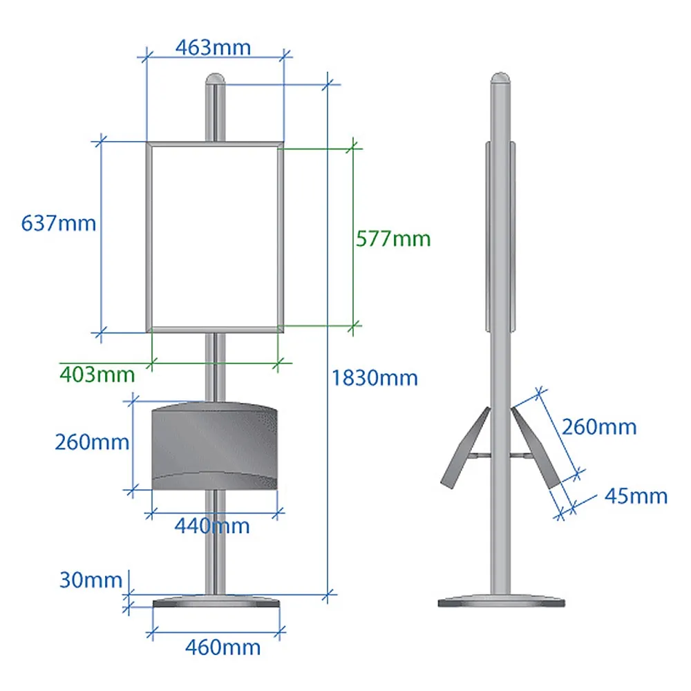 The advertising stand, also known as a poster display, also includes (2) A2 clip frames. These clip frames hold custom graphics, and are placed back-to-back to advertise in multiple directions at once. The advertising stand is 1830mm tall, easily visible in any location. The pockets rest below each poster frame, providing customers with valuable information regarding promoted products or services.