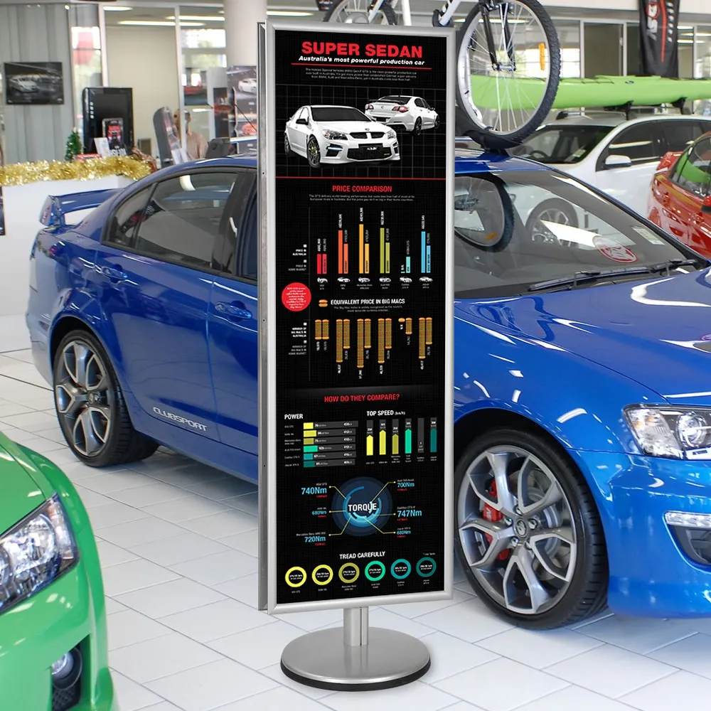 The display stand is part of the Sages System which gives you versatility when it comes to display methods. It gives you the option of adding and reconfiguring your display at anytime. With the poster holders, these are also easy to update. Simply by lifting the sides of the hinged frame will open up the frame and enable you to place your artwork with the protective lens on top into the frame. These lenses with a matte finish are designed to diminish light reflecting off you posters. The overall effect is a professional finish that can be updated or transformed to meet your requirements.