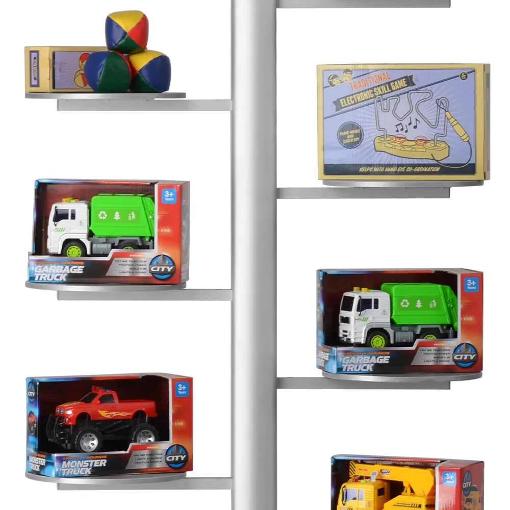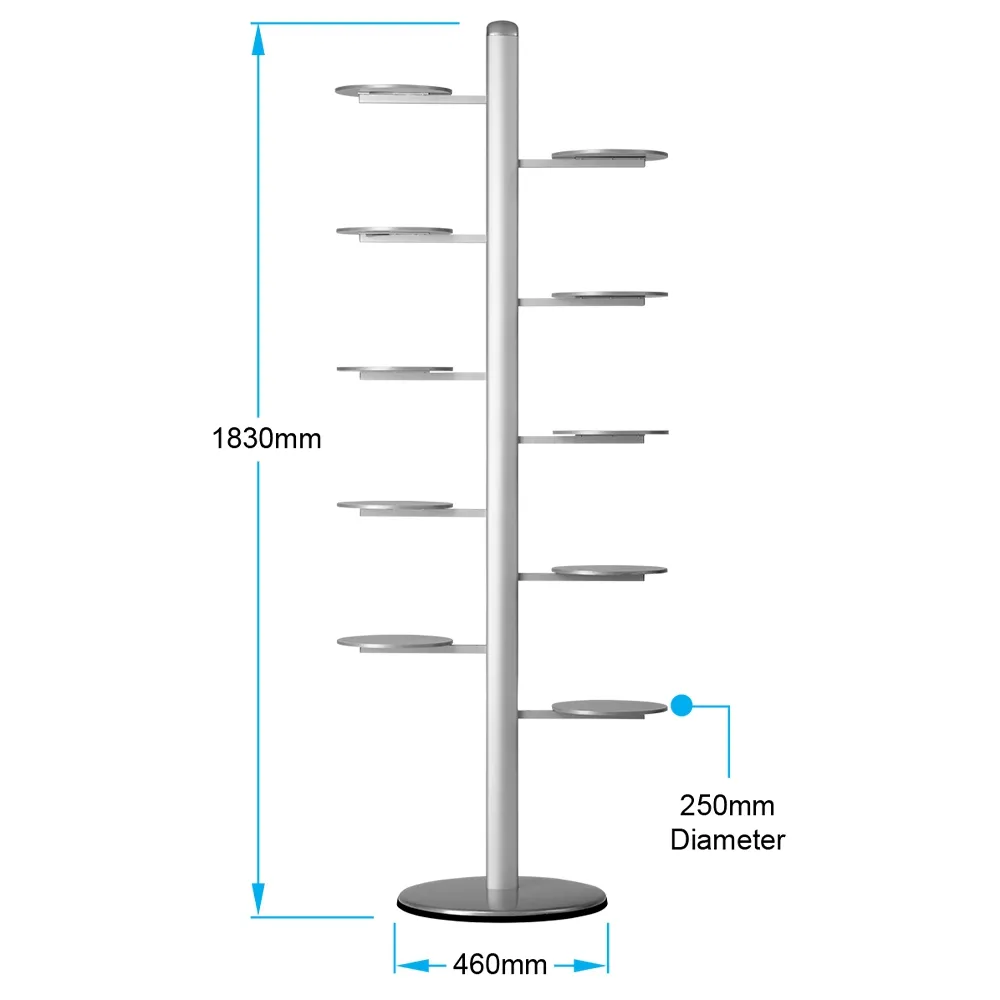 This display stand comes with 10 shelves which can be adjusted to any height on either side of the display stand to suit the products being shown. Each of the shelves has a circular surface of 250mm in diameter and can hold up to 4kg, allowing them to be used to display a wide range of products.