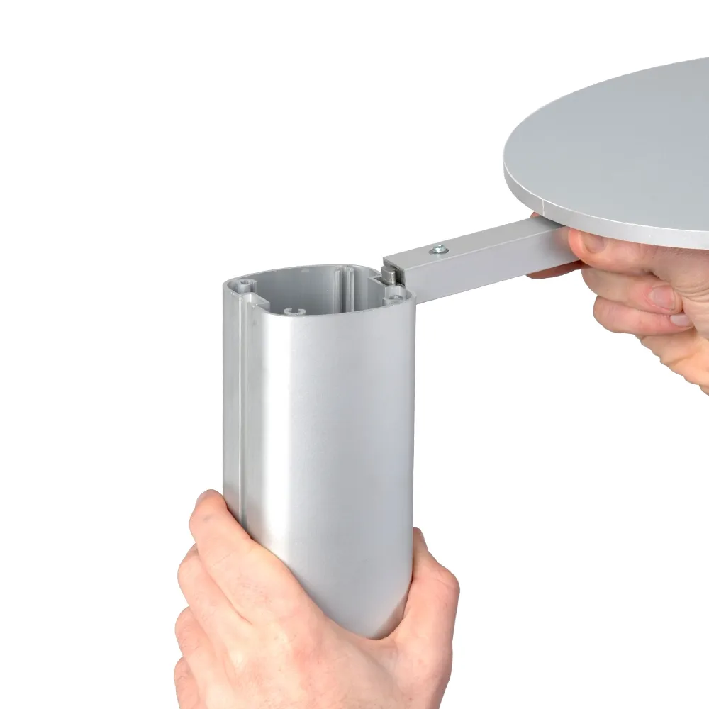 To save on shipping costs the shelves come disassembled from the pole, but simply slide into one of the channels on either side of the display pole and can then be moved to the desired height on the pole, before the grub screw on the support arm is tightened to lock them securely in place.