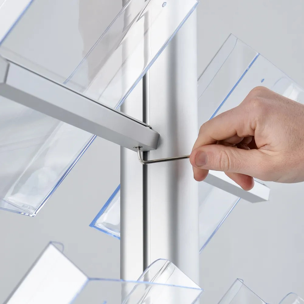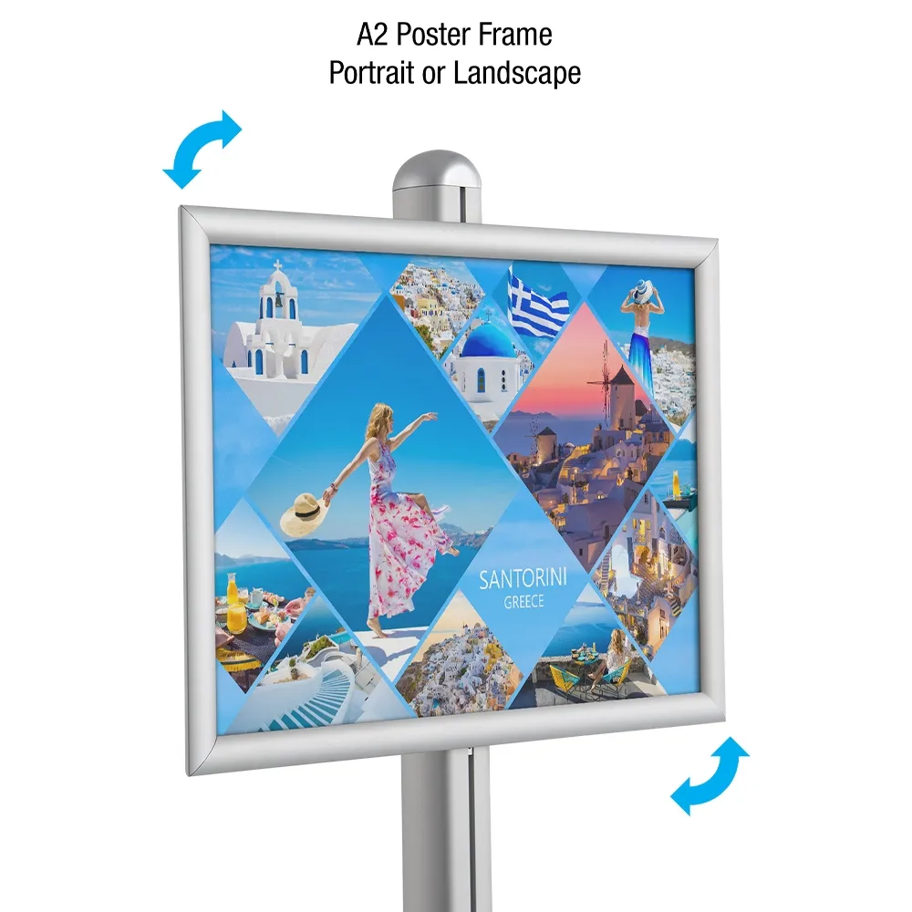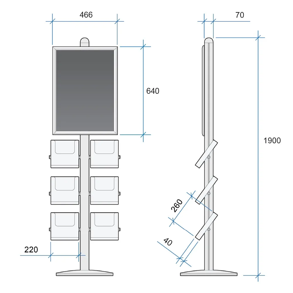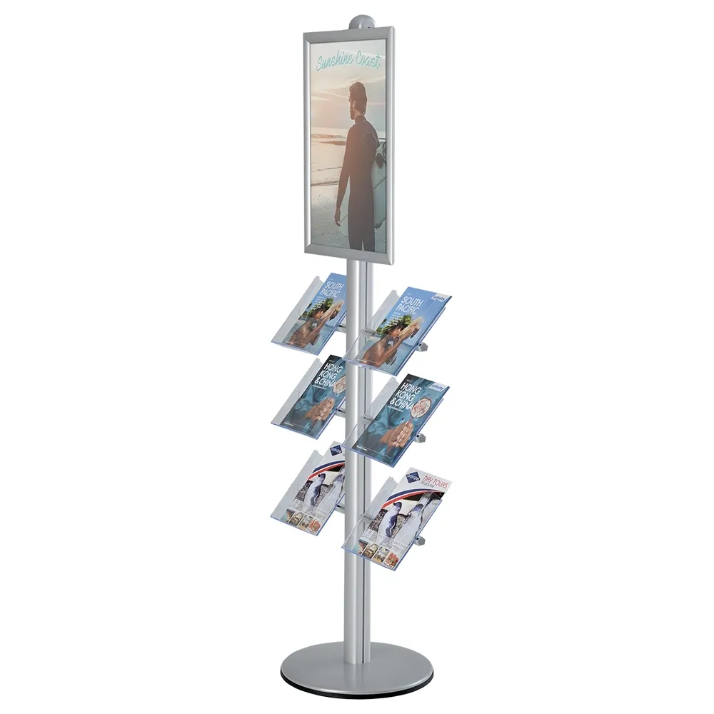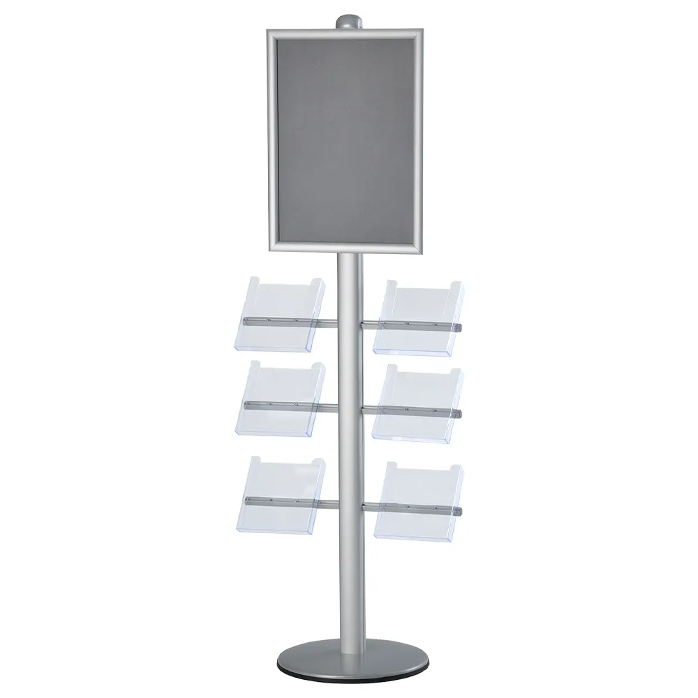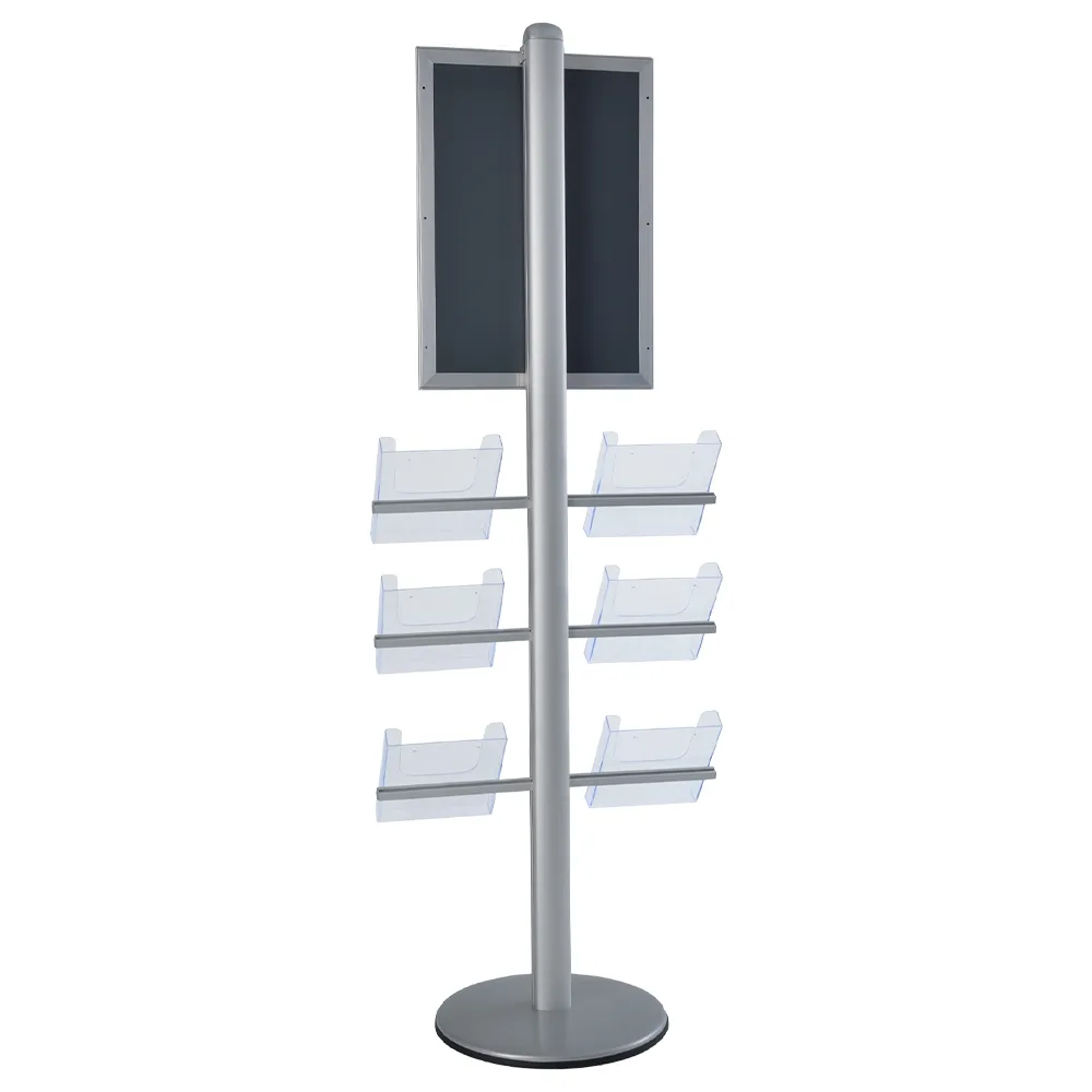 This Sages Series display stand features 6 acrylic brochure display pockets to accommodate A4 or DL brochure or promotional literature at the perfect height and angle. Also included is a single A2 clip frame poster holder. It combines a stylish permanence of presentation on a display stand that can be easily manoeuvred around you premises to suit.