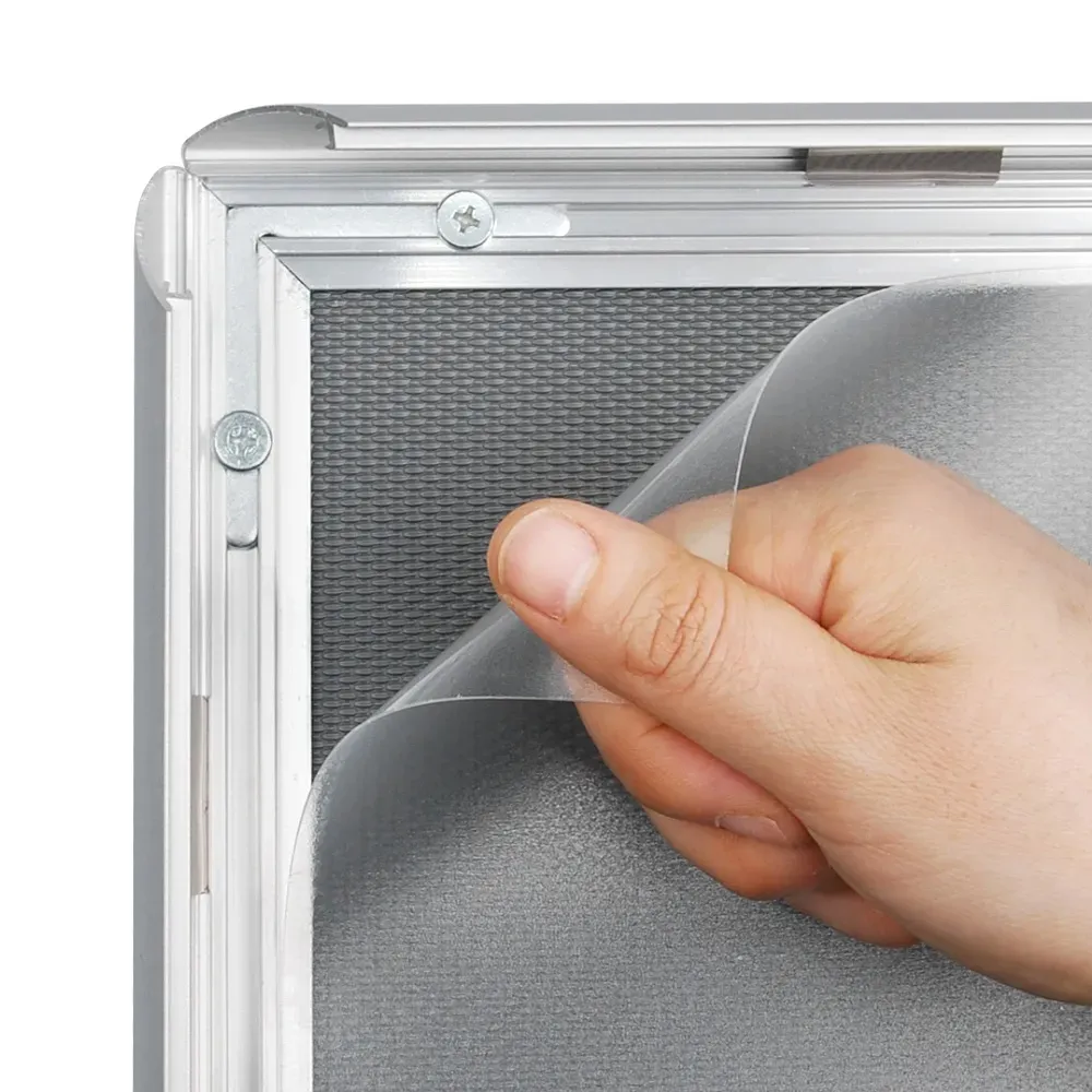 The poster frame uses a snap frame system so graphic changes are as simple as you like, taking less than a minute. The frame of the poster holder hinges open and you place your poster behind a clear polypropylene sheet to keep it protected and looking great.