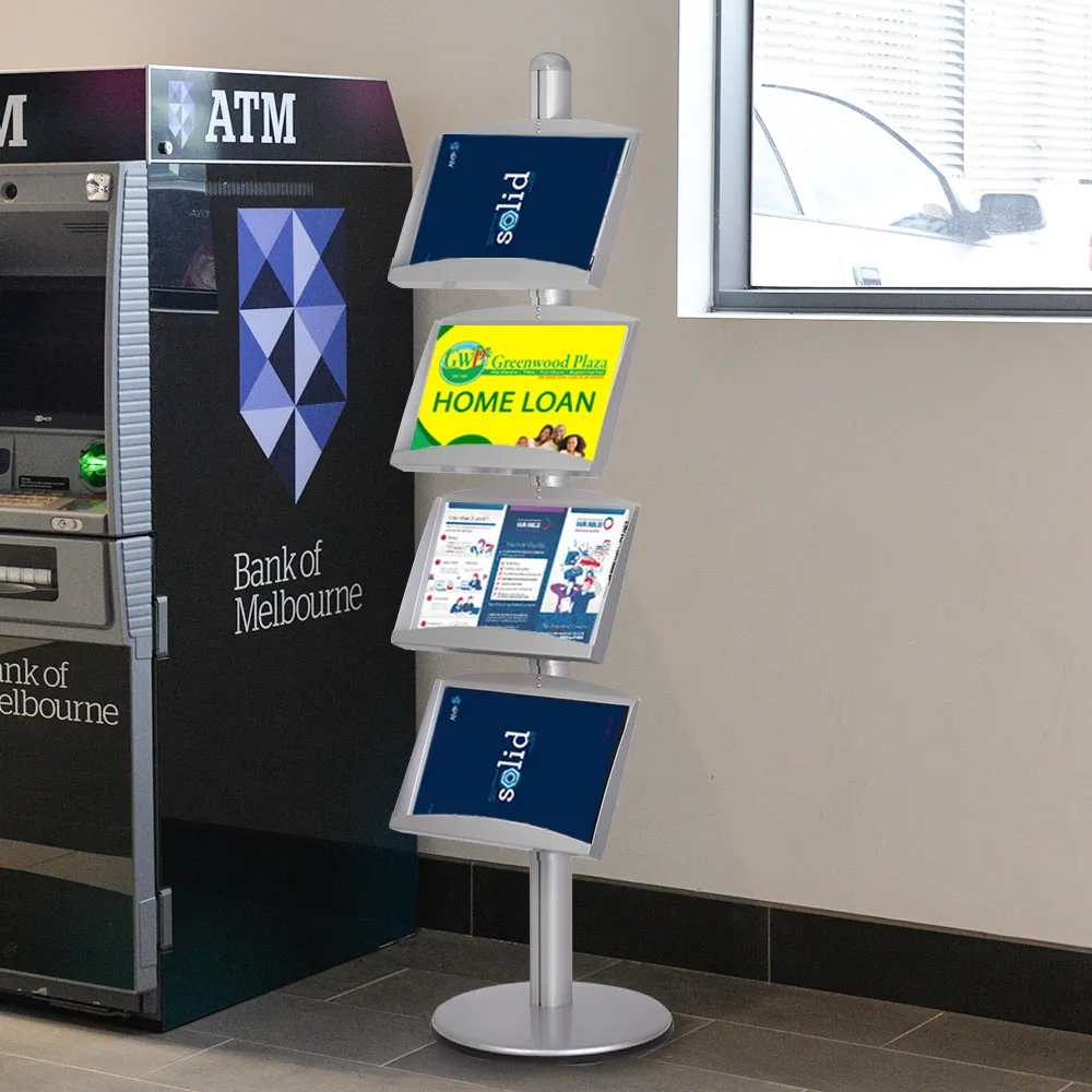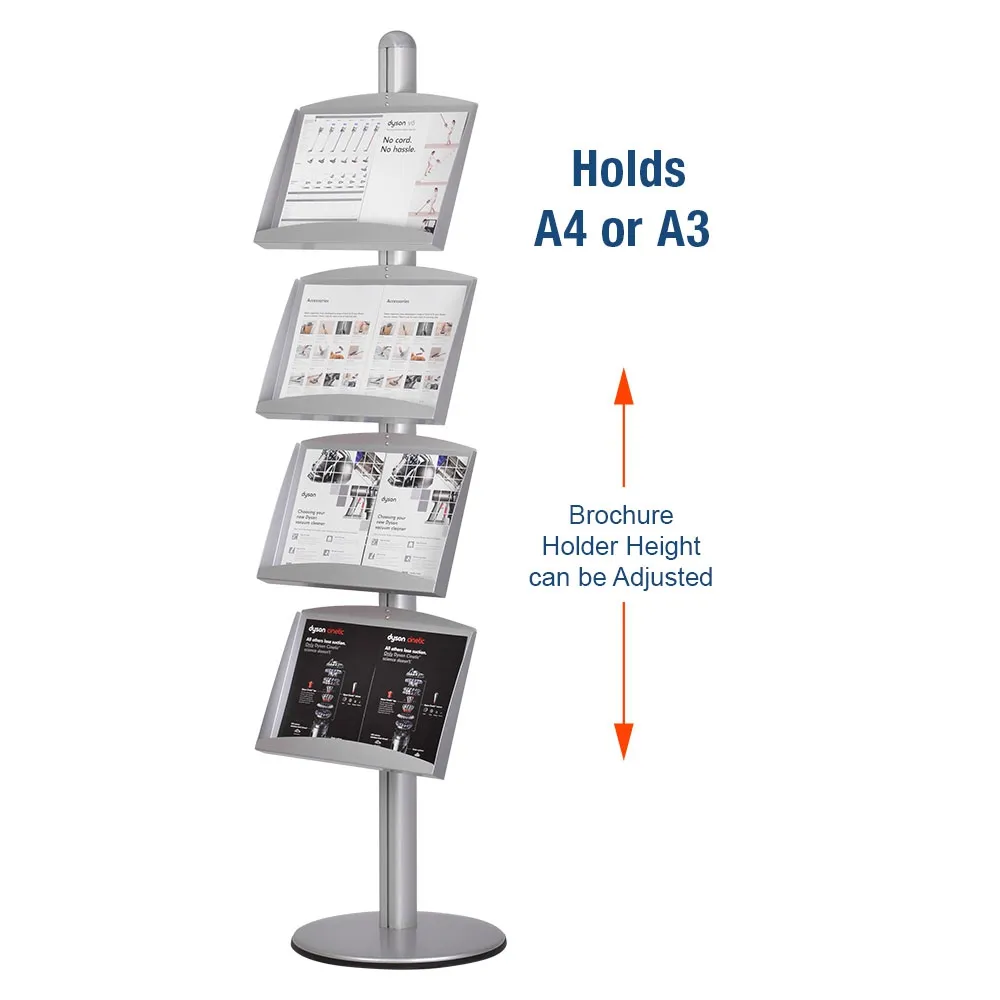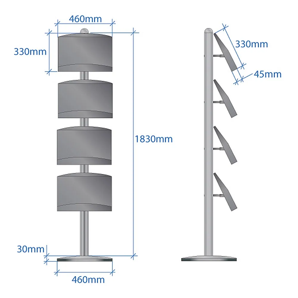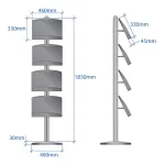 These shelves each can hold (2) A4 brochures or magazines. Eight total catalogues are able to be displayed on this unit. The brochure holder, literature shelf is 1800mm tall, allowing for different configurations to easily be achieved. The base and pole of each unit are made from anodised aluminium, providing a stable unit for use in heavily trafficked areas.
