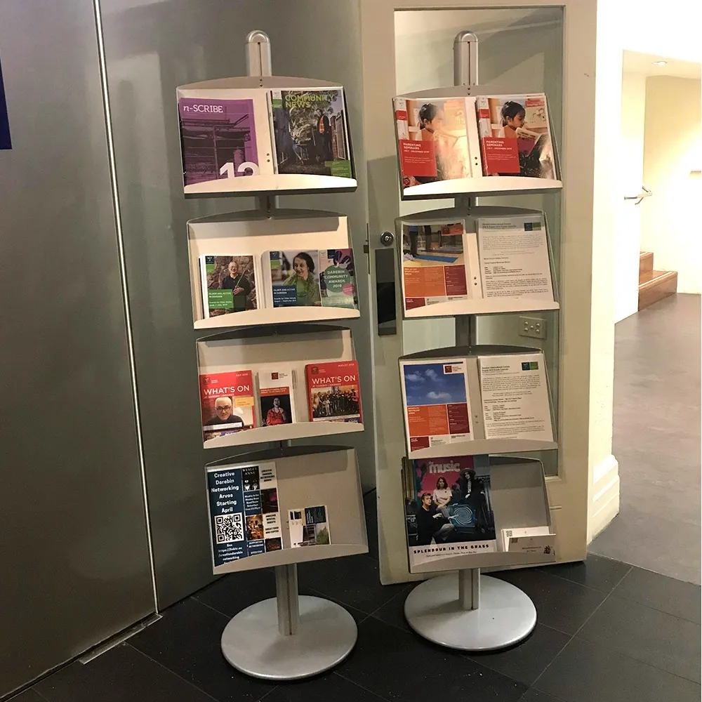 The literature shelf has a silver finish that easily fits in with most locations. These displays are typically found in shopping malls, travel agencies, retail stores, information centres, and exhibition centres. The literature shelf, like a display stand, has unique European styling that sets it apart from the competition.