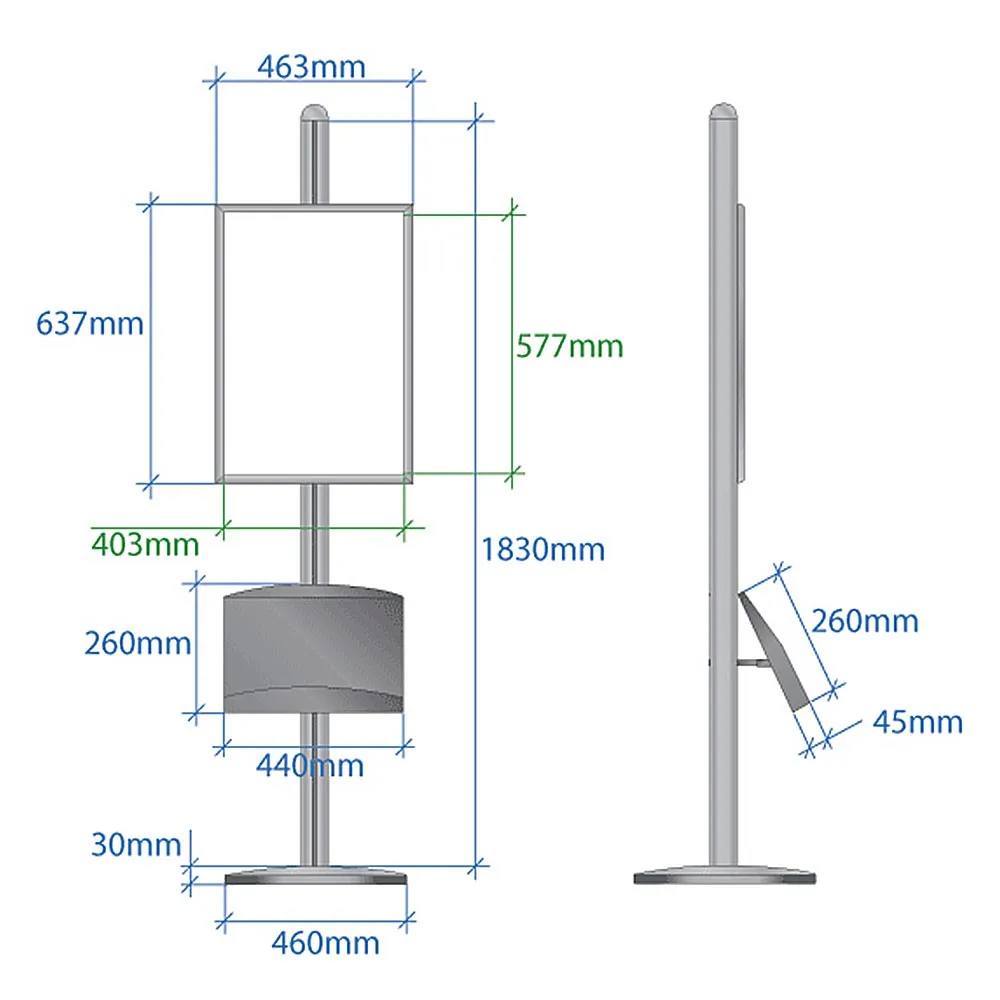 The information display has a simple design that is appealing in any location. The sturdy anodised aluminium base and pole are durable, even in heavily trafficked areas. The tall unit stands at 1830 mm, easily visible from anywhere in a room. The modular design of the unit allows for the brochure holder to be left off if a promotion only requires the clip frame.