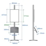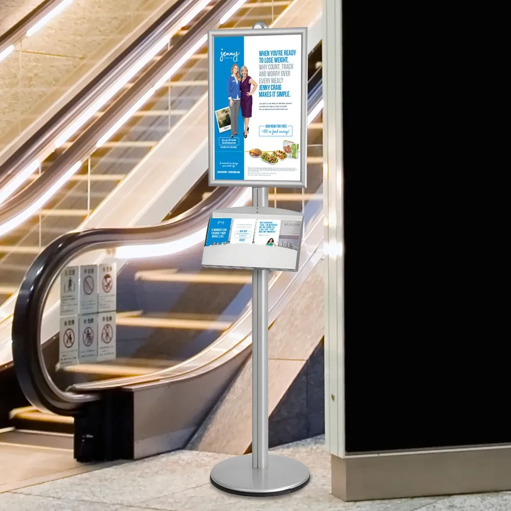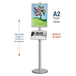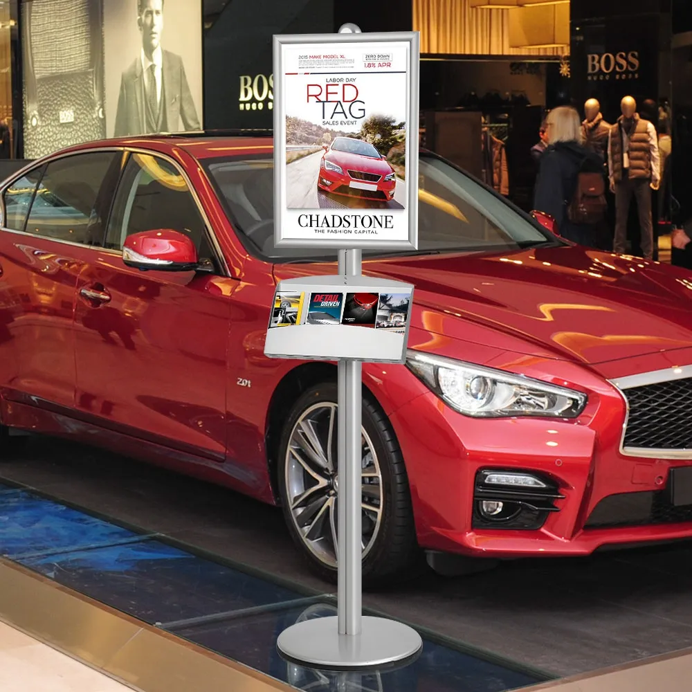 The information display, like a poster stand, also includes a 440 mm x 260 mm brochure holder for placing literature. The metal pocket is powder coated to prevent chipping and be scratch resistant. The information display has (4) pockets to hold DL format brochures (tri-fold A4). The pocket is angled up 25° for easier reading by passersby. This poster stand, information display has a European design with a silver finish, easily blending in with most locations. The advertising stand is typically found in retail stores, schools, car dealerships, exhibition centres, and more!
