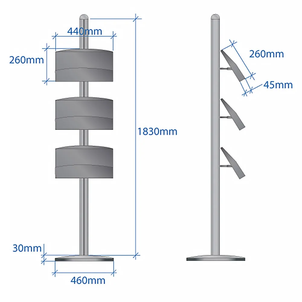These literature holders, brochure displays stand at 1830mm to easily capture the attention of passersby. Informational materials can be presented at eye-level for easy interaction. The brochure displays feature (6) adjustable shelves that are on both sides of the display. These shelves are made from powder-coated steel to make them durable for use in heavily trafficked areas just as retail stores and exhibition halls. The leaflet stands, brochure displays use shelves that are angled upwards 25° for easier viewing. By adjusting each shelf, there are multiple display possibilities available to best suit your business.