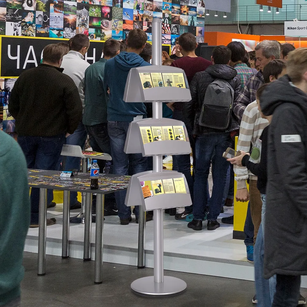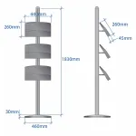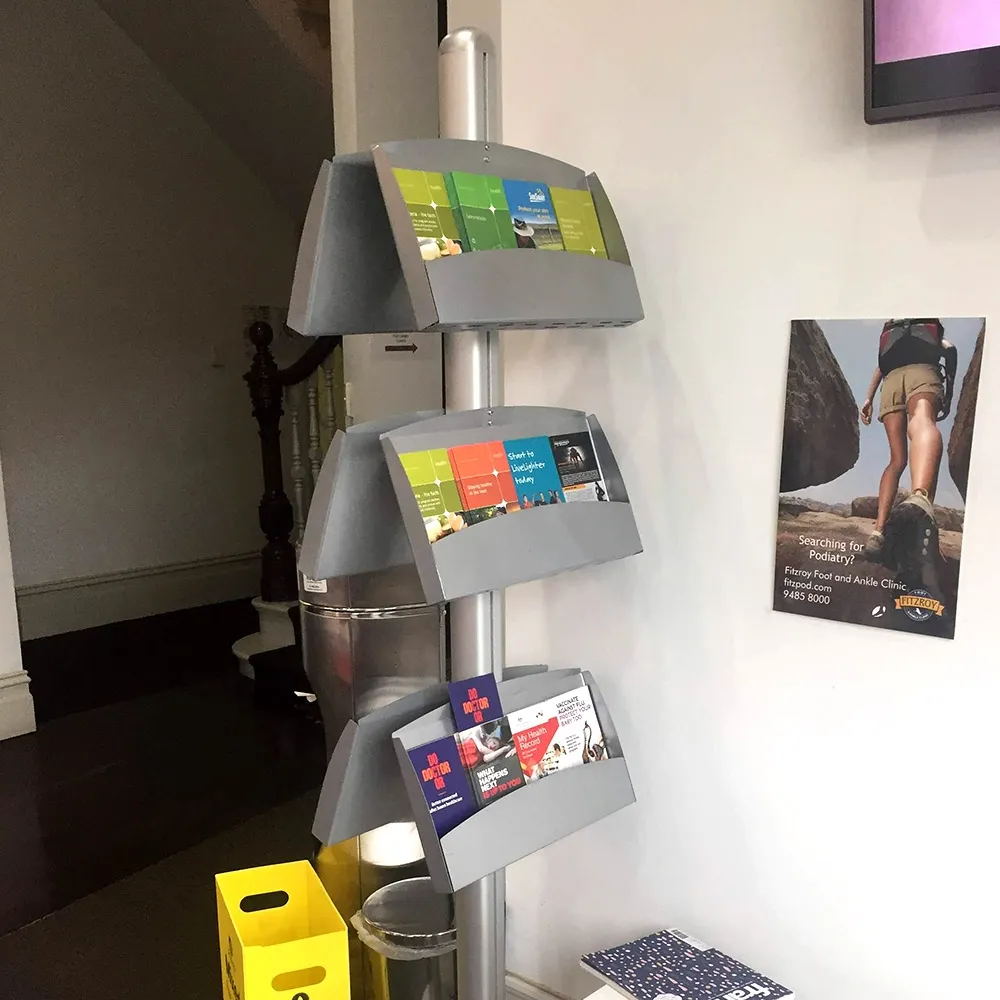 Literature holders, pamphlet stands, and other brochure displays can display up to (4) tri-fold A4 leaflets in each shelf. When totally full, these units can show 24 different informational brochures. The brochure displays have an anodised aluminium pole and base that are quite stable to support items placed in the stand.