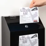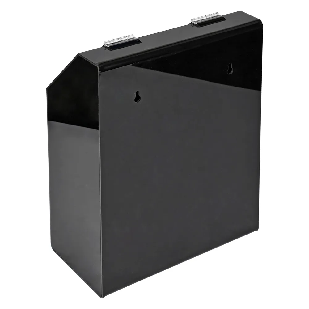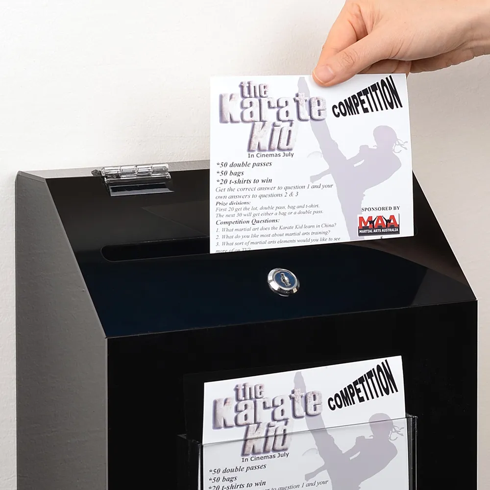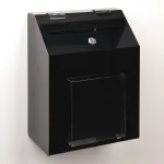 This wall mounted ballot box, like a suggestion box with lock, helps keep the items placed inside the display from being tampered with whilst in use in public areas. The suggestion box with lock is made from 3mm thick black acrylic, offering a stylish look due to the high gloss finish. The front of the display uses 3mm thick clear acrylic to form a pocket that helps keep forms at hand for customers to write their comments, suggestions, cast their vote, or fill out an entry form to place in the leadbox.