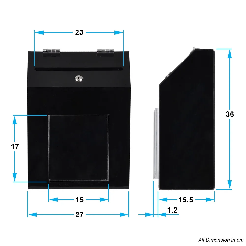 The wall mounted ballot box is versatile display, able to be placed on a countertop or installed on a wall using (2) screws that hold the display through keyhole cut-outs on the back. Similar to acrylic sign displays, the suggestion box with lock are able to be used in any location due to their neutral colour scheme and low cost. An additional feature of the display is that large slot is 230 x 13 mm so that placing filled out forms inside the case is extremely easy!