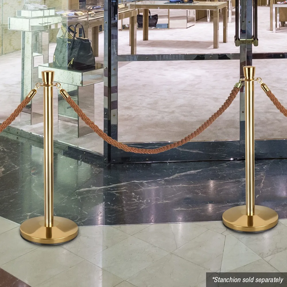Queue management ropes are great for movie theatres, retail stores, bars, clubs, valet parking, special events, information centres, art galleries, and more to section off areas or help guide visitors as they wait. The rope features a rich brown colour and braided design for a stylish look that is at home in many different decors. At 2m, this rope easily reaches stanchions and wall clips that can support the clips on each end. These clips are gold for a classic complementary look to the rope, with thumb locks that make securing to posts & clips easy and ensure they remain in place.