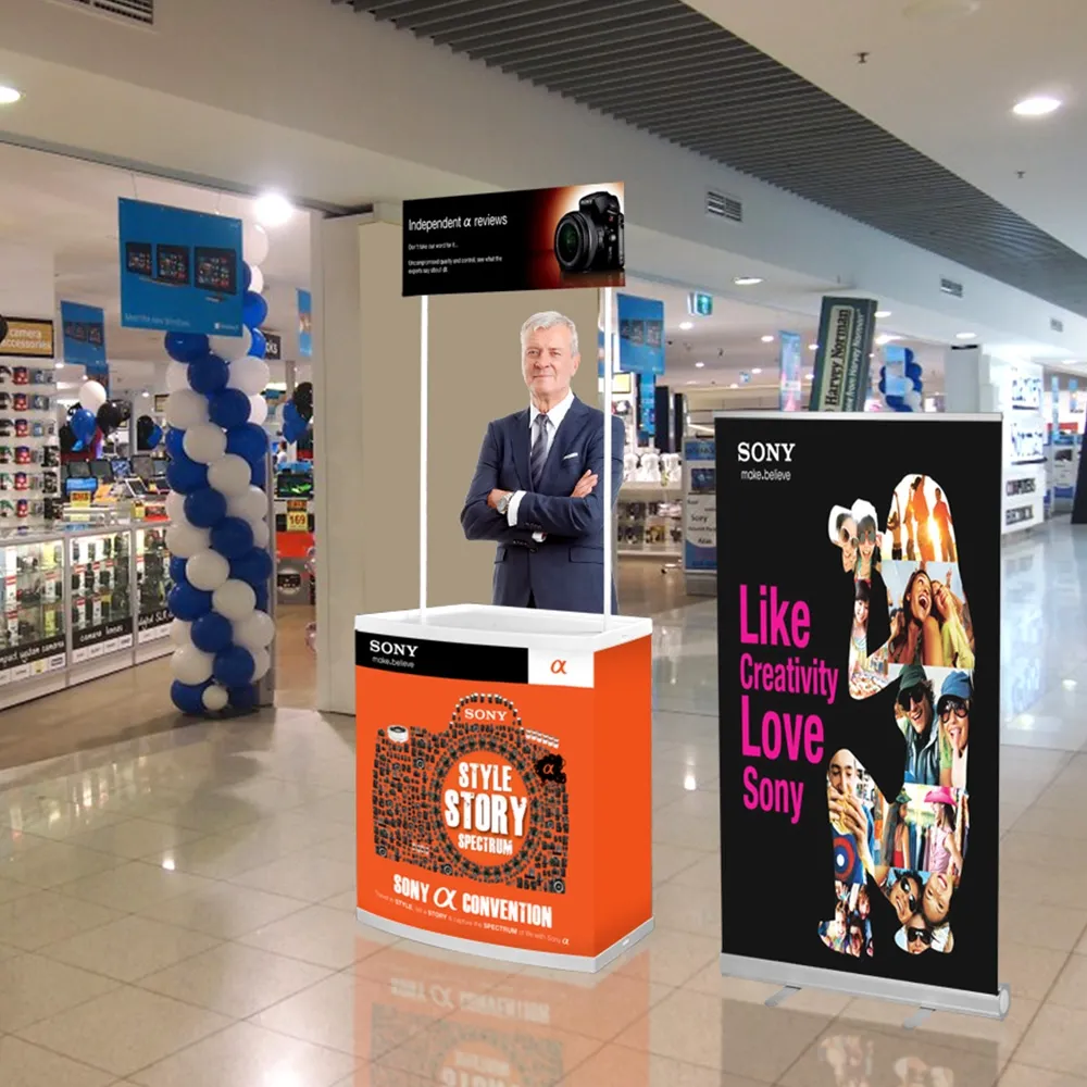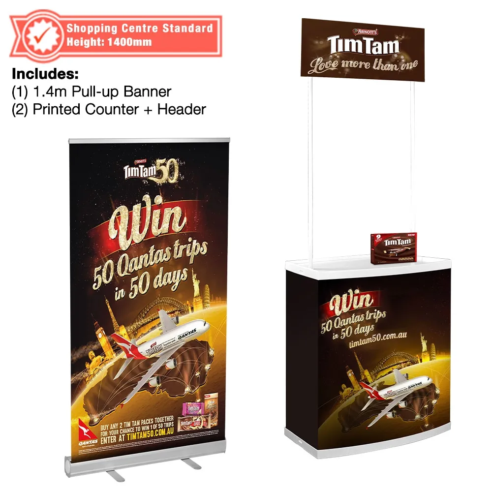 The shopping centre stands include a 1.4m tall pull-up banner, conforming to the standard for use in shopping centres. The graphic itself measures 850 x 1400mm to provide heaps of space for your custom designs to get the attention of passersby. No tools are needed for assembly of the exhibition pop up displays in minutes! There is also a greeting counter that also lets you have designs printed on the front of the counter as well as a header that stands tall to easily be seen. The interior features a shelf that is great for placing beverages and additional items.
