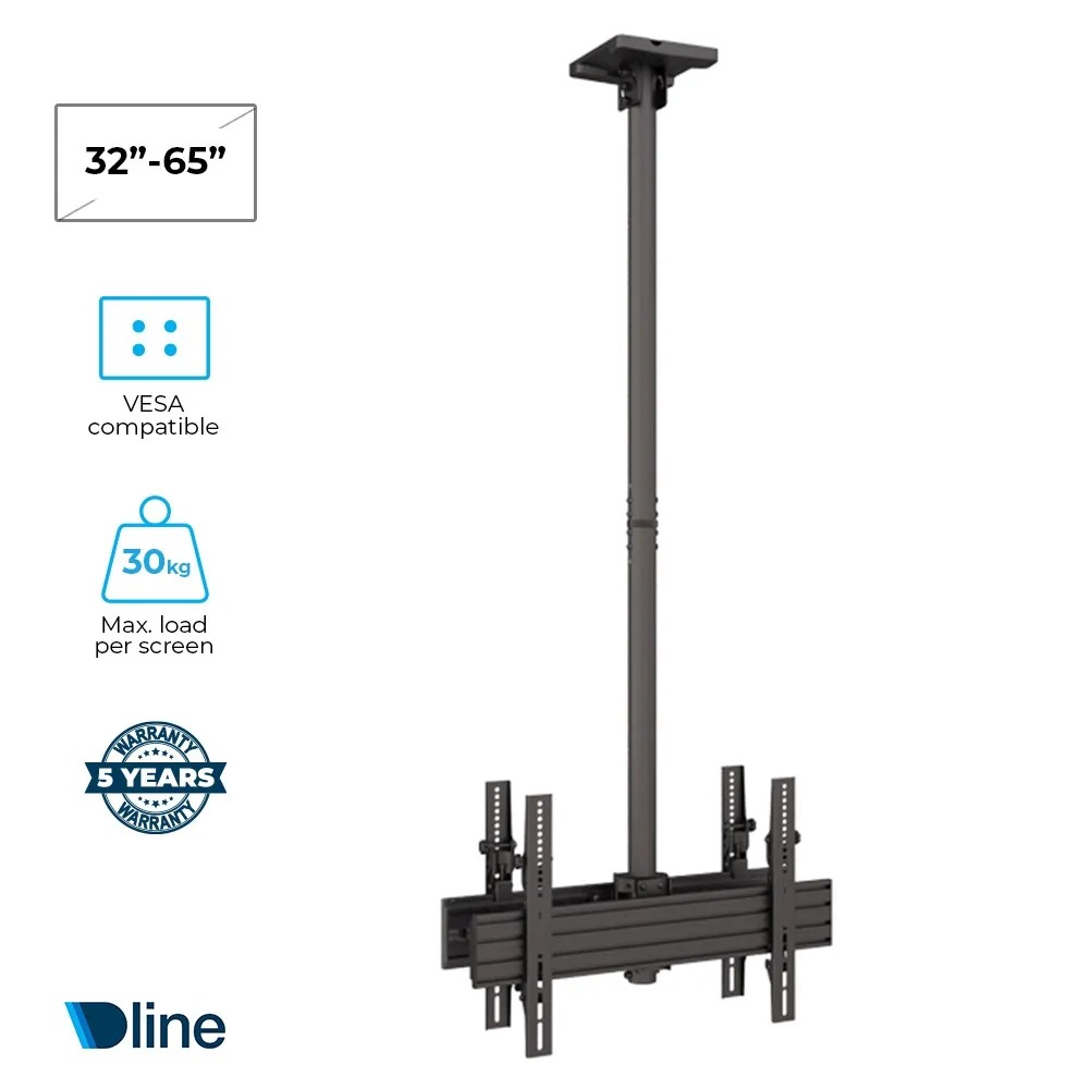 TV brackets ceiling mount offers a durable and space-saving solution for suspended flat panel installations. Designed with strength and practicality in mind, this mounted system supports two back-to-back screens, ideal for wayfinding or promotional displays in public settings. The black powder-coated steel and aluminum construction proides a robust build that holds up well in all locations. The versatile television mounts support 32" to 65" screens that weight up to 30kg each. The universal bracket has integrated tilt from -6° to +15° and adjustable orientation for easy screen positioning. Full VESA compatibility (100 x 100 to 600 x 400mm) make this unit adaptable for various uses across high-traffic spaces.