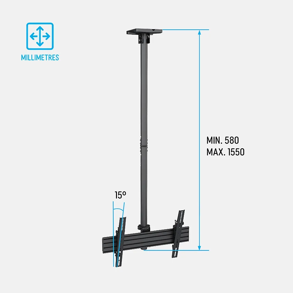 The TV ceiling bracket, a versatile flat panel television mount, offers flexibility in how the screen is displayed to ensure it works in every location. The 1.5m pole mount design extends easily down from a ceiling and the universal mount can tilt the screen -6° to 15° for best view. The VESA compatible mount works with 100 x 100 to 600 x 400mm hole patterns for uss with many televisions. Whether you’re a real estate agency presenting property showcases or a tour company delivering updates to groups, hanging a screen with this display keeps your content clearly in view.