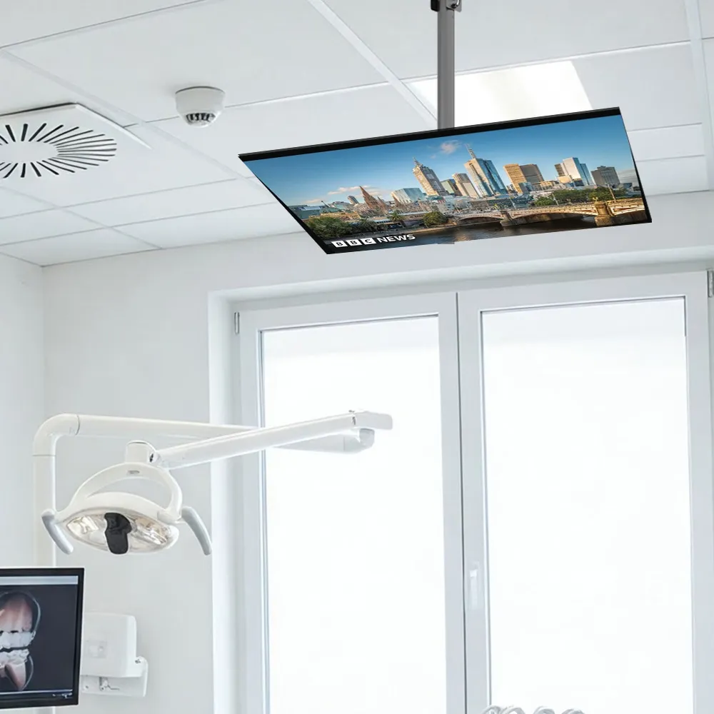 The ceiling mount TV is a smart way to display screens securely in tight, high-traffic areas. The downward-facing mounts support 32” to 75” screens and hold a weight of up to 50kg, giving you the strength and flexibility needed for displaying screens in busy dental clinics, hospital rooms, or tight retail aisles. Whether you're keeping reception areas clutter-free or improving comfort for patients who may be lying down, the built-in screen locking mechanism adds peace of mind by protecting valuable screens in these environments. It attaches easily to flat, angled, or slanted ceilings, which is ideal for unconventional layouts often found in the healthcare or retail sectors.