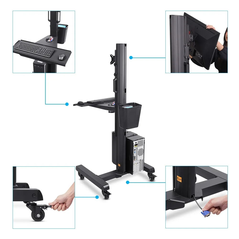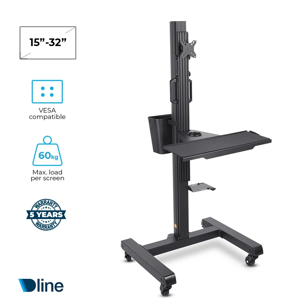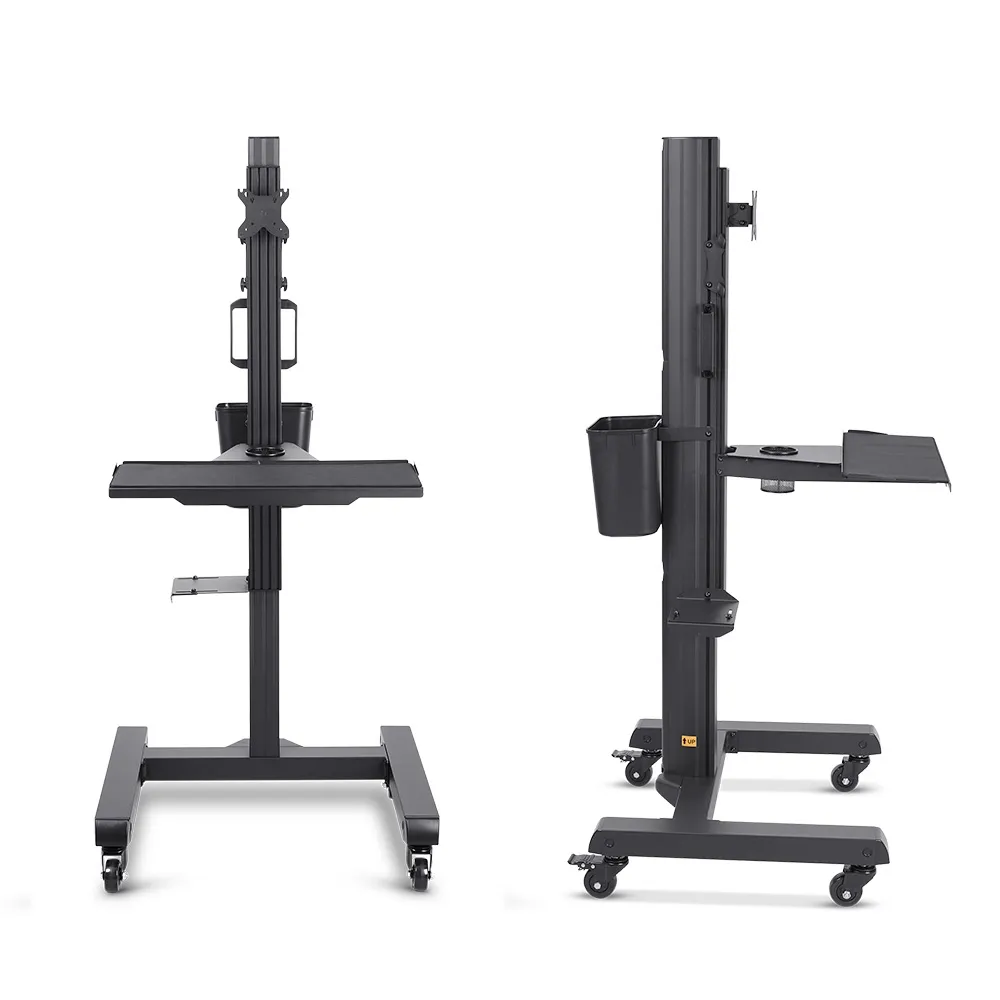 The rolling TV cart, like a portable television stand with wheels, includes a VESA-compatible mount from 50 x 50mm to 100 x 100mm hole patterns to suit a range of flat screen models. Designed for maximum convenience, it also features a built-in keyboard holder that can hold a weight of up to 10kg. A dedicated box shelf that supports up to 5kg is also ideal for carrying media players or compact devices. This wheeled television stand is a practical fit for mobile workstations across automotive workshops, healthcare clinics and business campuses. Whether you're delivering presentations, accessing digital diagnostics, or managing content remotely, this mobile television trolley gives you a professional, all-in-one setup without the clutter of fixed installations.