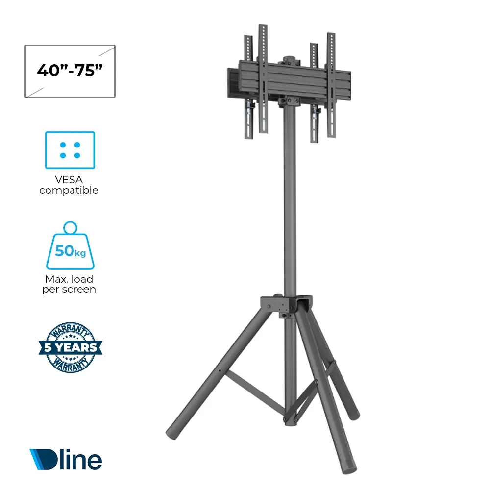 This multi TV stand delivers a distinctive and portable display solution, perfect for exhibitions, visual merchandising, or gallery setups. Tripod-style easel stands support two flat screen televisions back-to-back, turning your content into a visual centrepiece from all angles. The aluminium mounts suit 40" - 75" screens that each weigh up to 50kg, engineered for stability, strength, and style in high-traffic indoor areas.