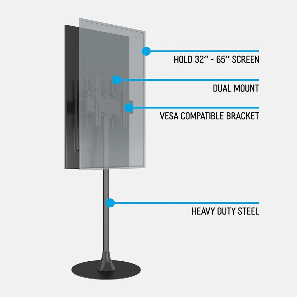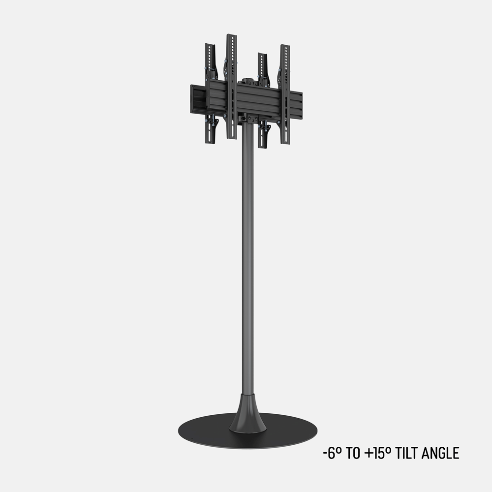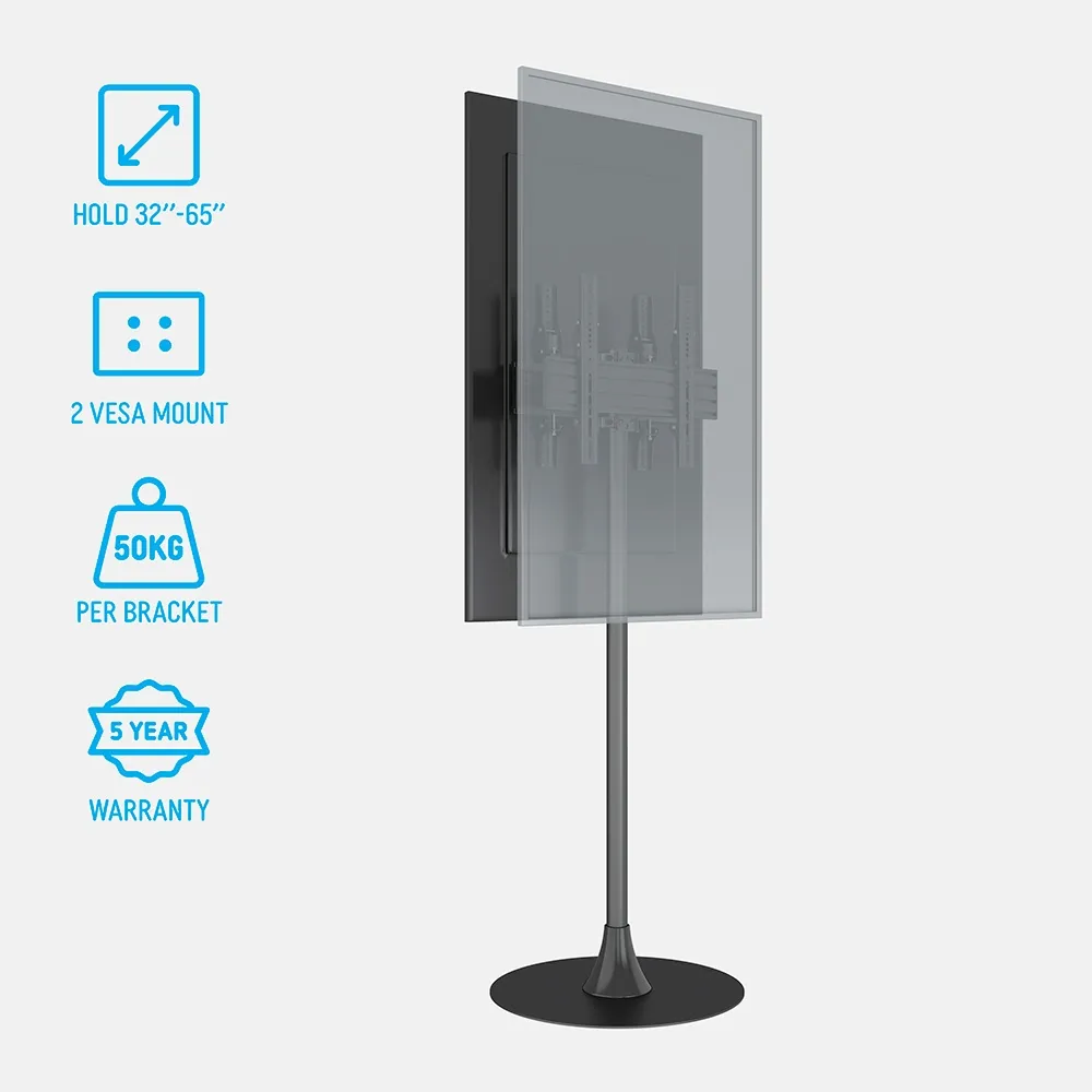 The dual Vertical TV stand, a freestanding commercial mount, is well-suited to lobbies, shopping centres, and foyer areas where directional or promotional signage needs clear visibility. The 1.5m tall freestanding TV mount has a built-in cable management system that keeps wires organized and hidden. The large base offers great stability whilst reduceing tripping hazards. the floor TV pedestal has a modular design to make installation quick and adjustments easy, allowing you to switch layouts as needed without fuss.
