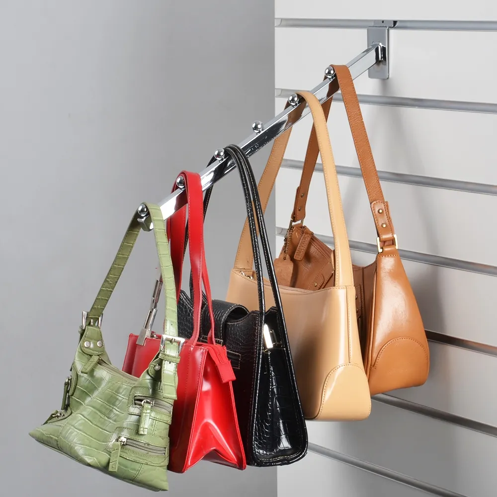 A 6 ball waterfall is a standard slatwall accessory for retail stores, especially clothing and handbag shops. This style of hook can have multiple items hung to create a full display that is still easily accessible for customers. The fitting is 450mm long to make displaying different items easy, with a downward angle that helps make viewing and removing items on offer easy for customer and employee alike.