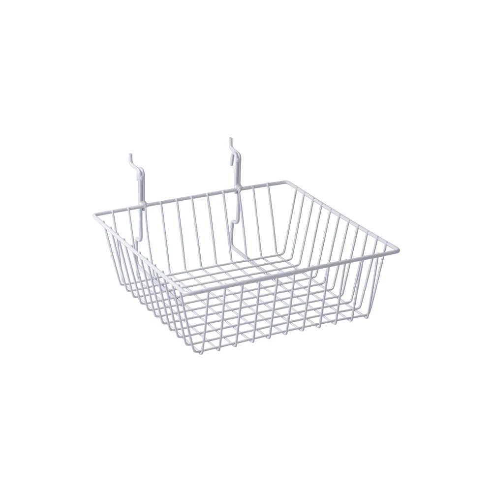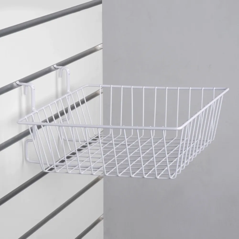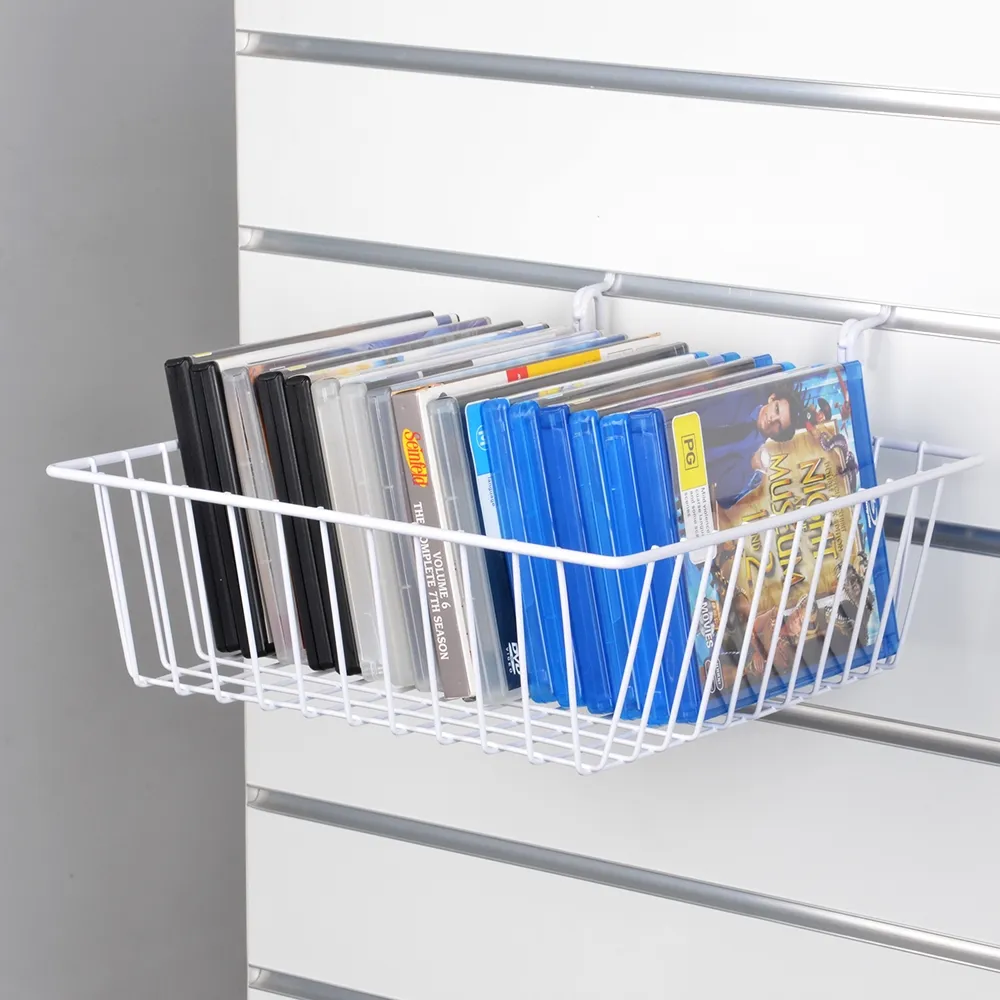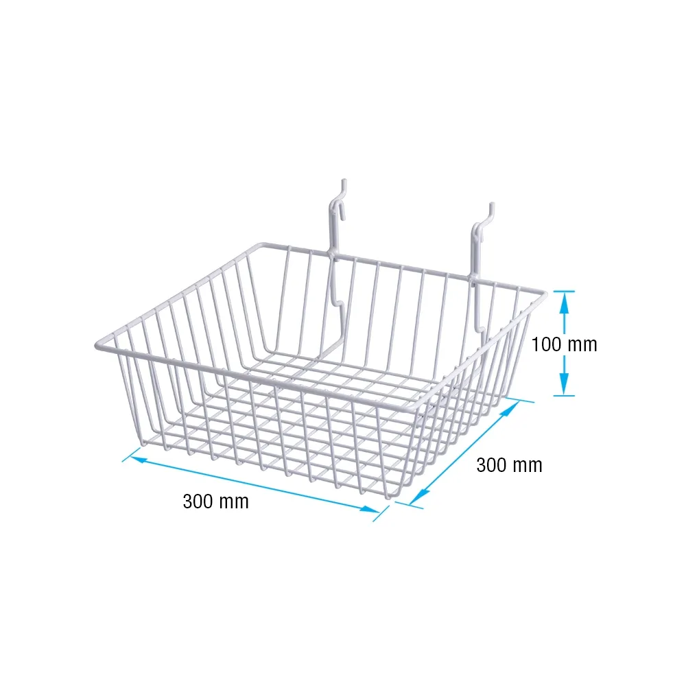 These Slat wall accessories, white pegboard baskets are great for a number of locations to effectively display items, including retail stores, shopping centres, news agents, gift shops, and books stores. This basket is 300 x 300mm to hold many styles of product without an issue. The 100mm depth of the unit allows for not only boxes of product, but bulk display of smaller items that will stay within the basket even as customers are rifling through.