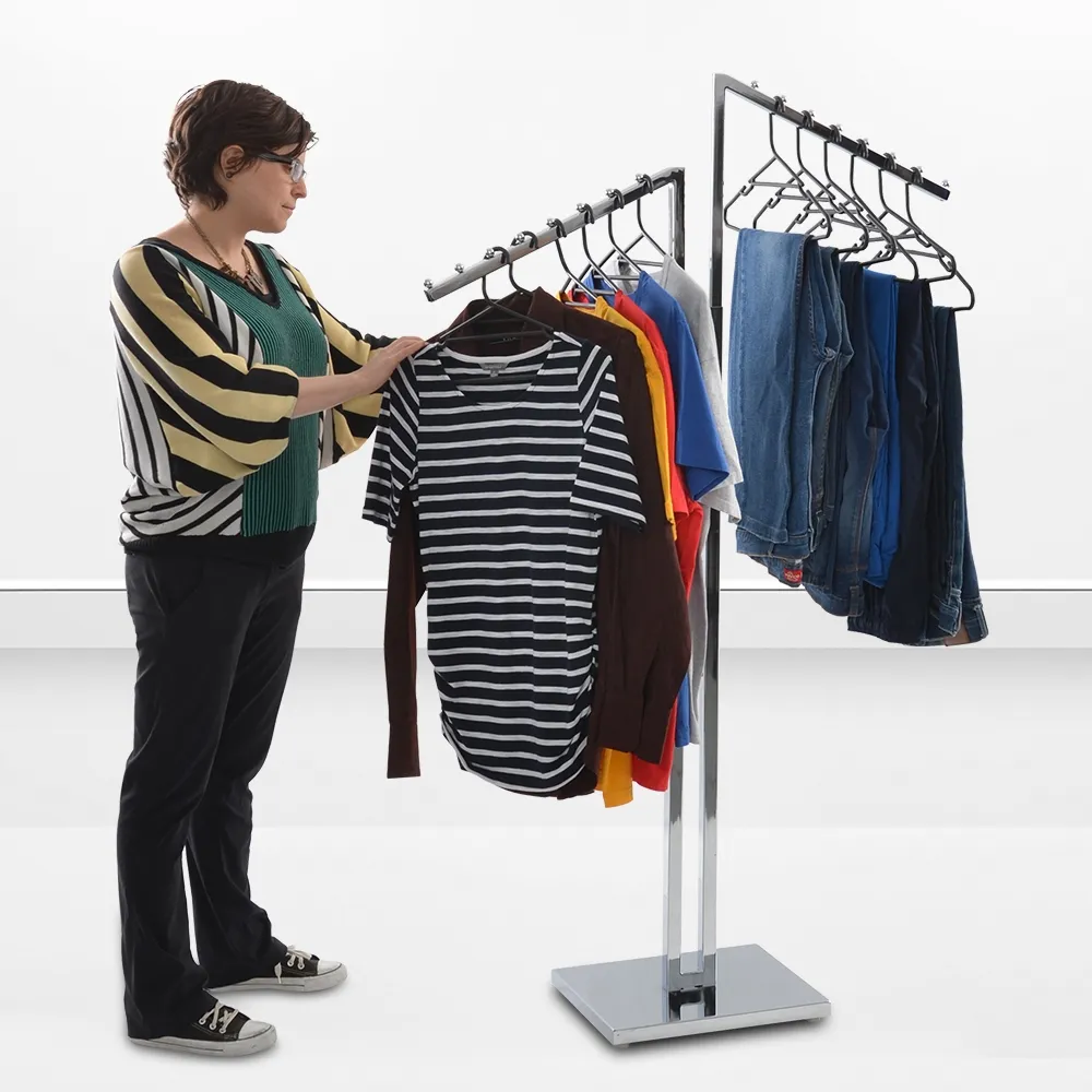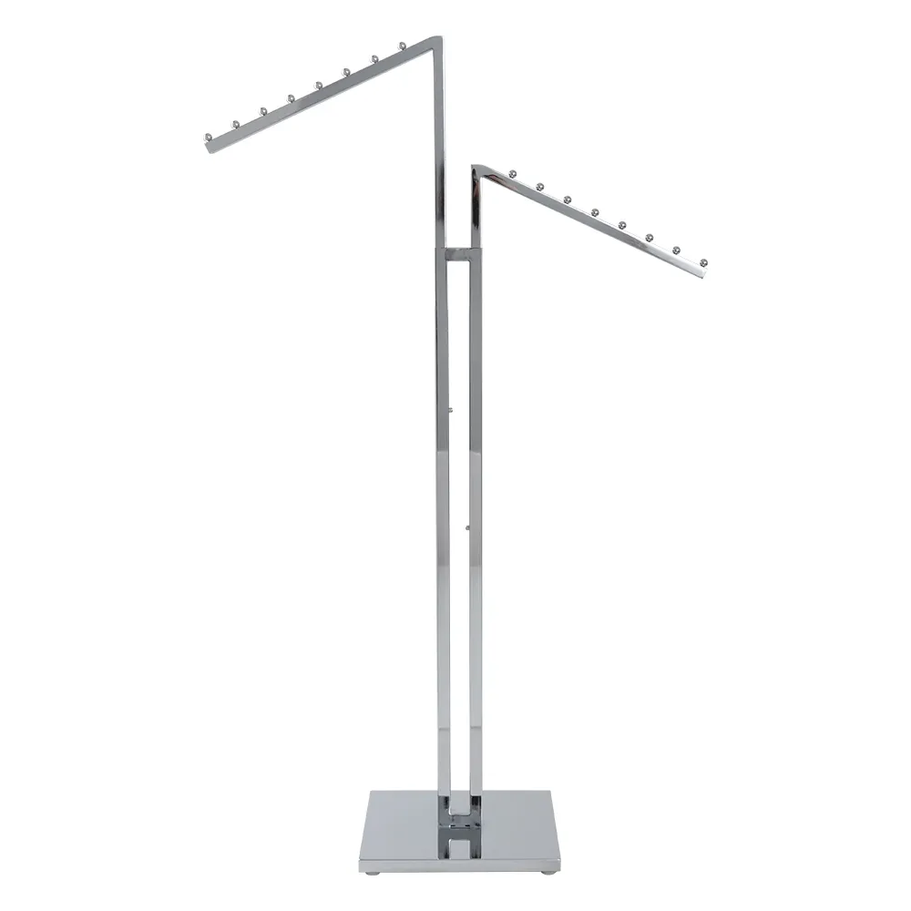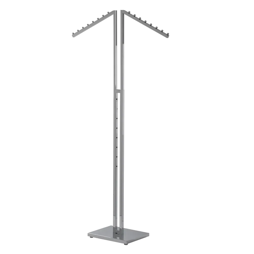 This slant arm clothes rack is great for hanging a range of items for customers to browse through. The commercial garment racks are typically used to hold clothing on hangers, with different sizes and colour options on display so customers can find the right choice for their specific needs. This garment stand is height adjustable to accommodate anything from shirts and pants to long dresses and jackets! The push-button design makes height adjustments between 1250 and 1790mm fast and easy in (8) set 75mm increments.