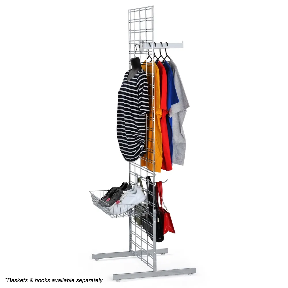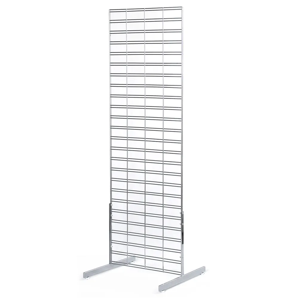 This wire store fixture, standing grid has a single 1850 x 610mm gridwall mesh panel to provide ample space for hanging items. The dual-sided display helps you maximise space on your sales floor by having a single 610 x 630mm footprint whilst allowing customers in multiple directions access to the display! The T-leg base of the stand uses adjustable feet to level the mesh display fixture on uneven surfaces to provide a stable 2-way stand.