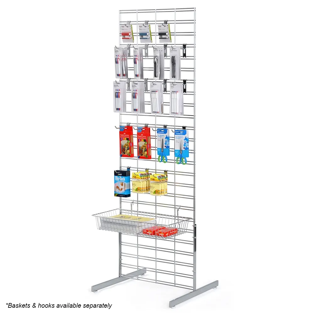 Using a standing grid in your store makes it easy to arrange products for customer browsing! The gridwall display systems use baskets, hooks, shelving, and other accessories to hold products in place on the 1990mm tall rack on each side. The top of the gridwall display has a max load of 5kg, and items weighing up to 10kg can be placed on the lower region to allow heavier items to be merchandised. The slatgrids make it easy to attach accessories without any tools needs to provide a secure hold!