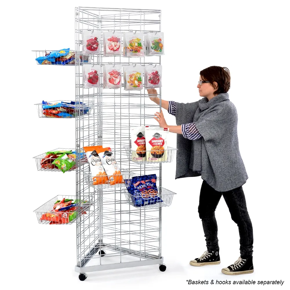 A portable gridwall display, part of our line of floorstanding retail displays, utilises grid panels to make customising the stand for your use simple. A variety of peg hooks, baskets, and shelving options are available to properly outfit this tower kiosk with your goods. There are (3) 1850 x 610mm panels for attaching these accessories to, each with slat grids to securely attach the accessories and safely hold items in place.