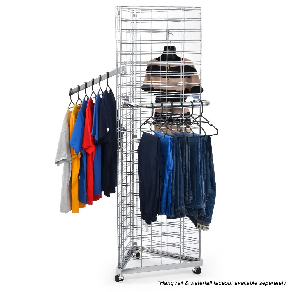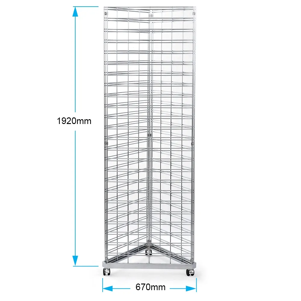 This portable gridwall display features a wheeled base for easy mobility around retail stores, shopping centres, trade shows, art fairs, and more! The free standing grid rack has a triangle design, helping to maximise your floor space by utilising a tower display that has a small footprint to allow easy movement around the stand. The 3-sided display is 610mm wide on each side, with the angled design making it easy to walk around as well as place other fixtures in close proximity without inhibiting visitors.