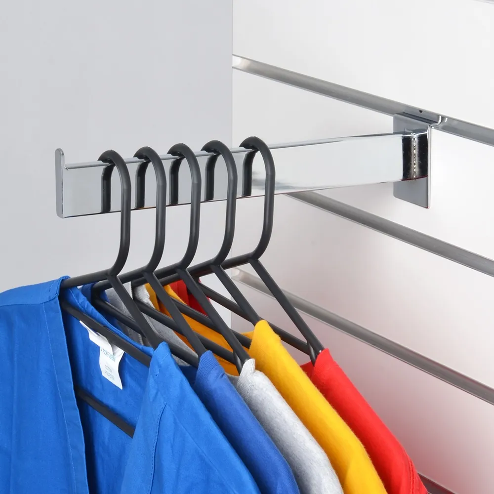 These heavy duty slat wall hooks are perfect for hanging merchandise and clothing on your slat panel fixture! Using retail slat wall accessories lets you customise the display to fit your needs, allowing you to maximise the space to best accommodate your goods. This hook is no different. The angled back easily slides into a slat channel to support items placed on the fitting, braced against the panel itself for extra support.