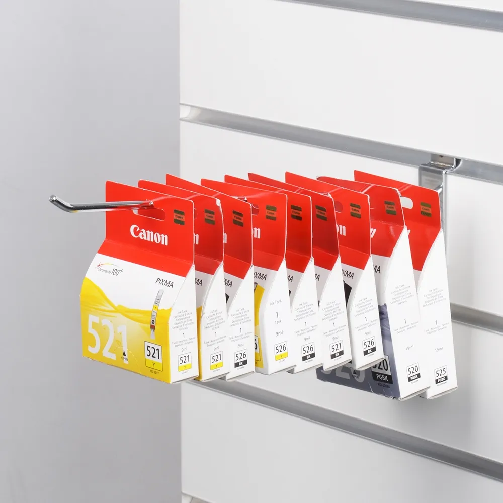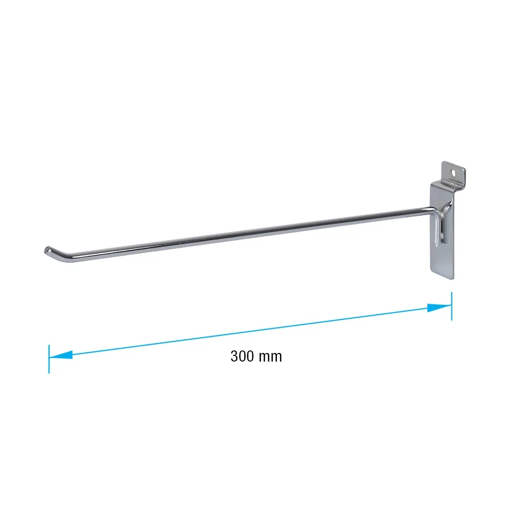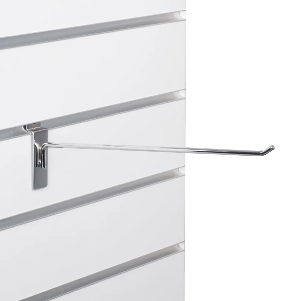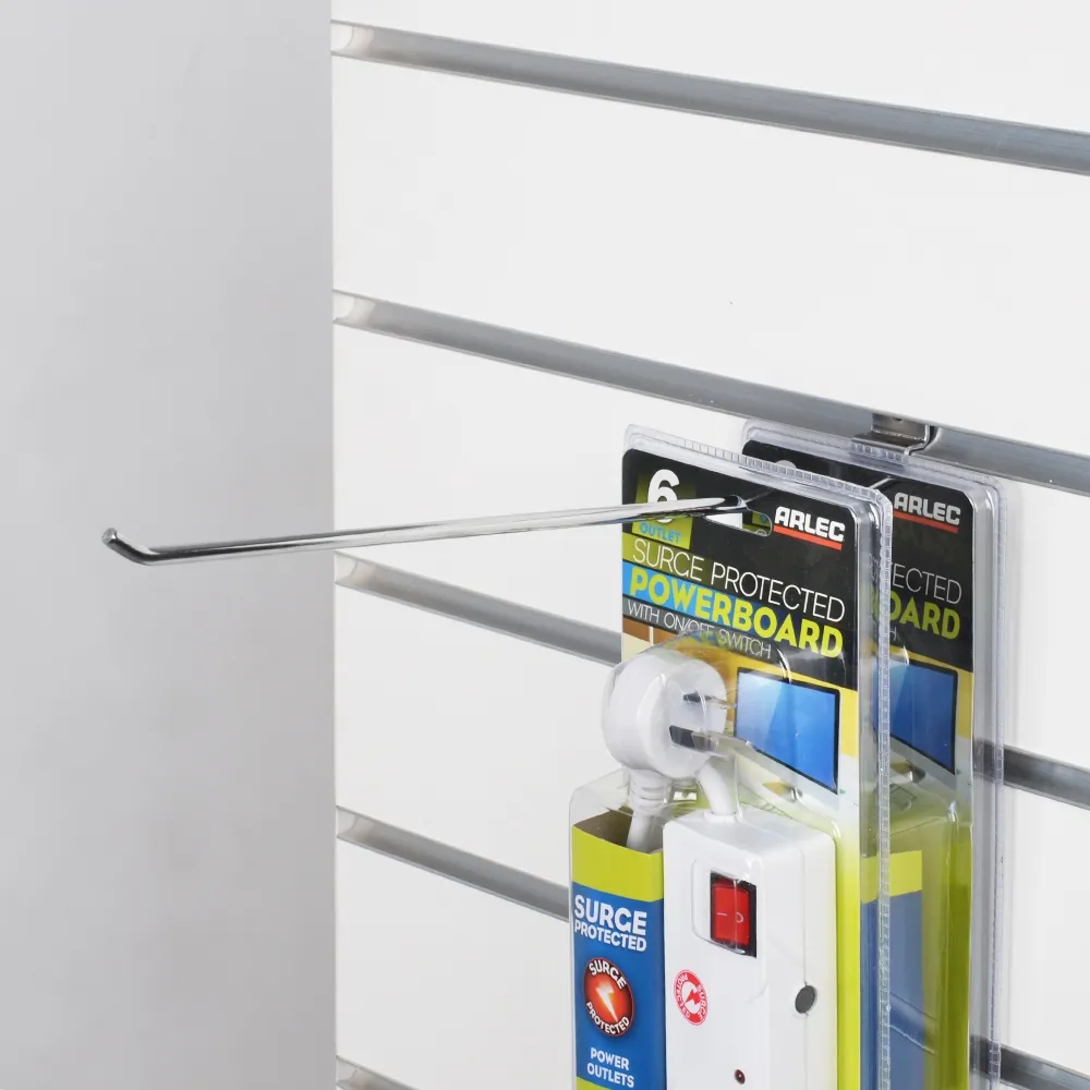 Use slatwall display hooks to mount product on your slat board fixture! Like all slat wall accessories, these fittings enable you to display product in blister packs or by themselves to make browsing simple for customers. The versatile fitting has a tab on the back to easily slide it into a slat channel and position it along the track. The hook is designed to hold up to _kg in total to support most styles of products typically used with this fitting.