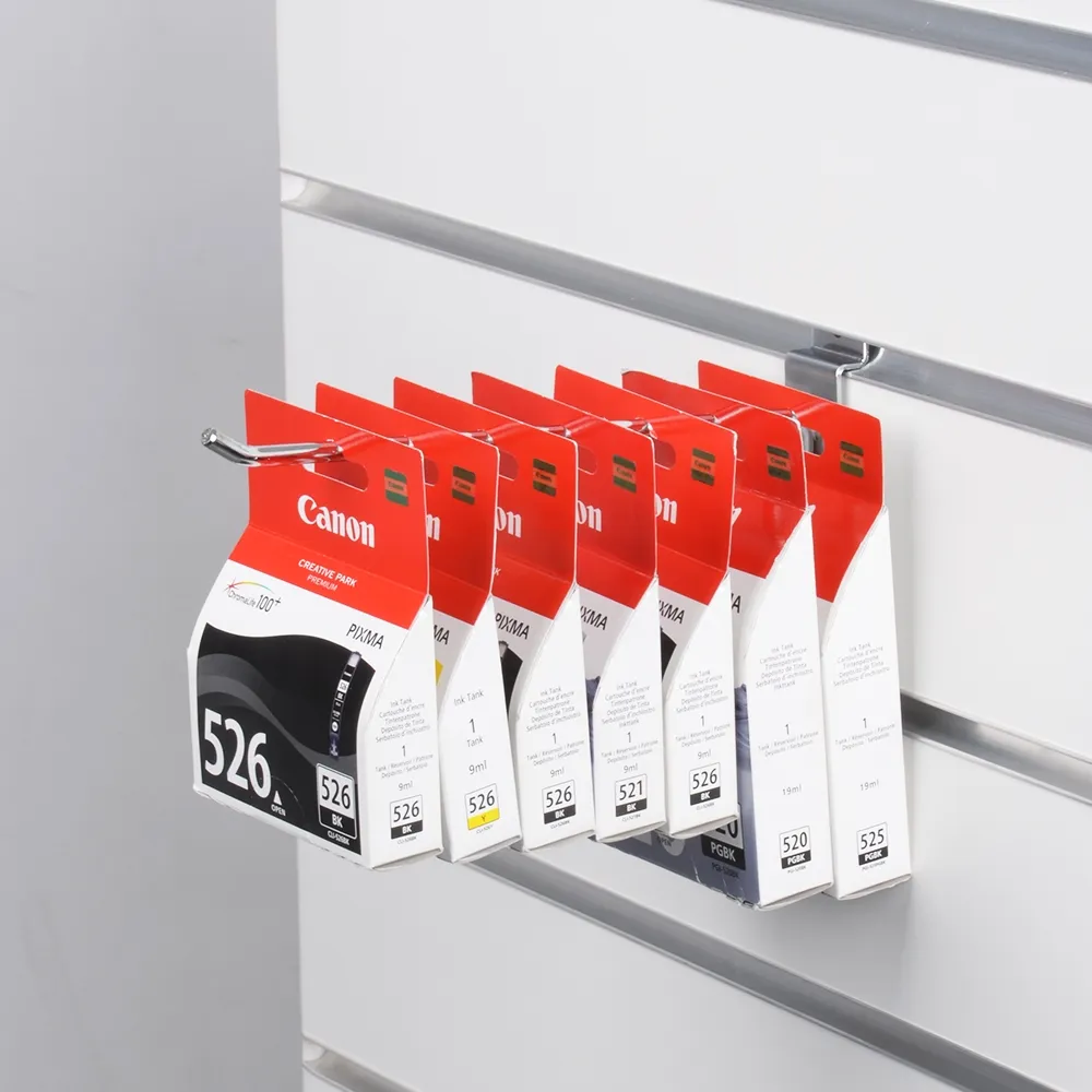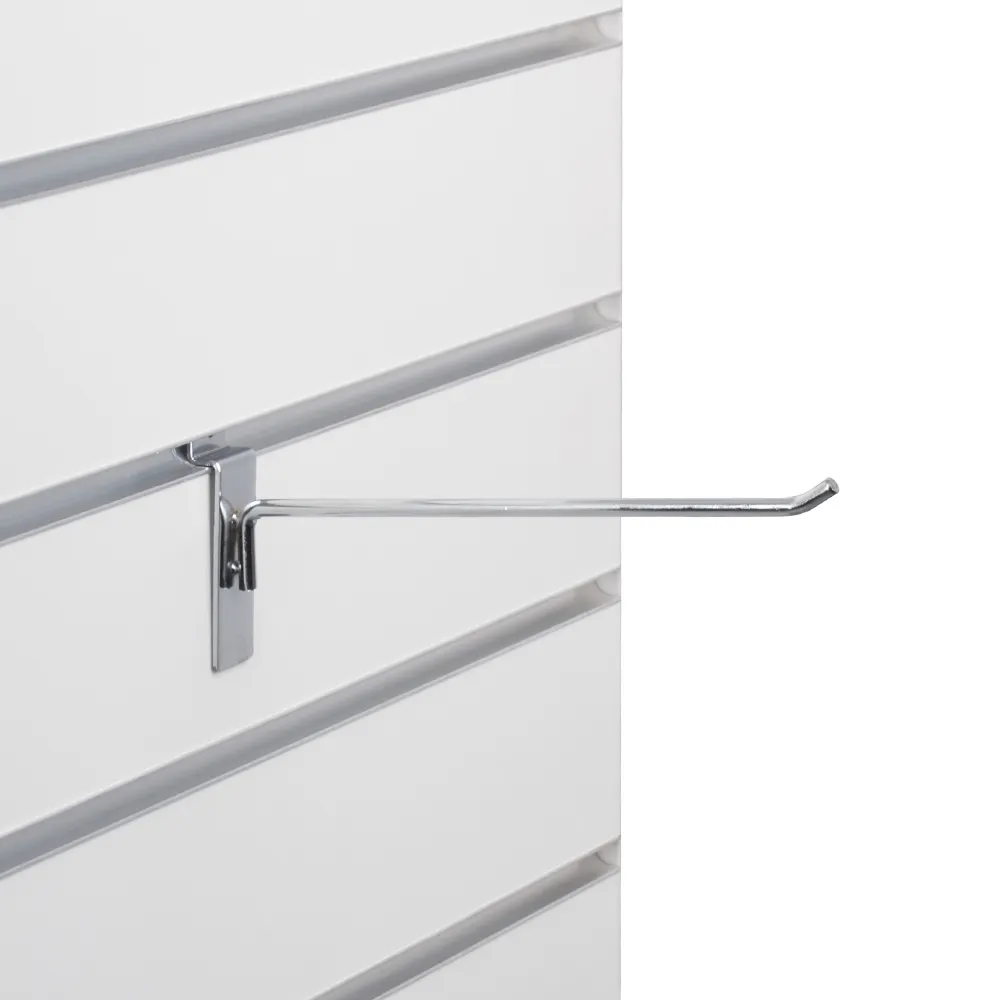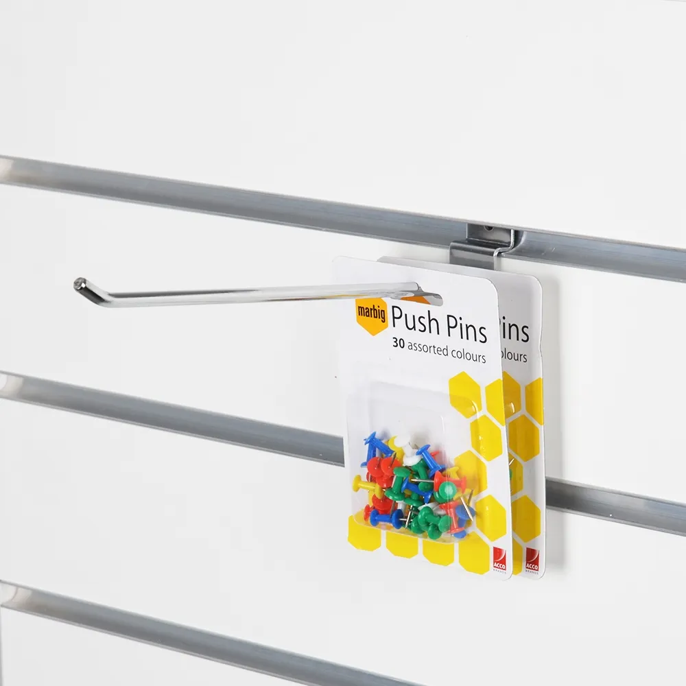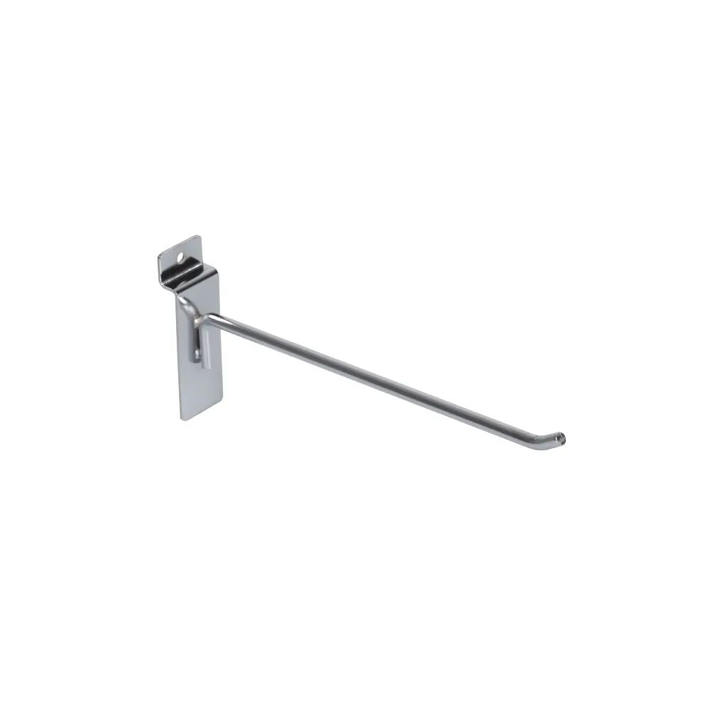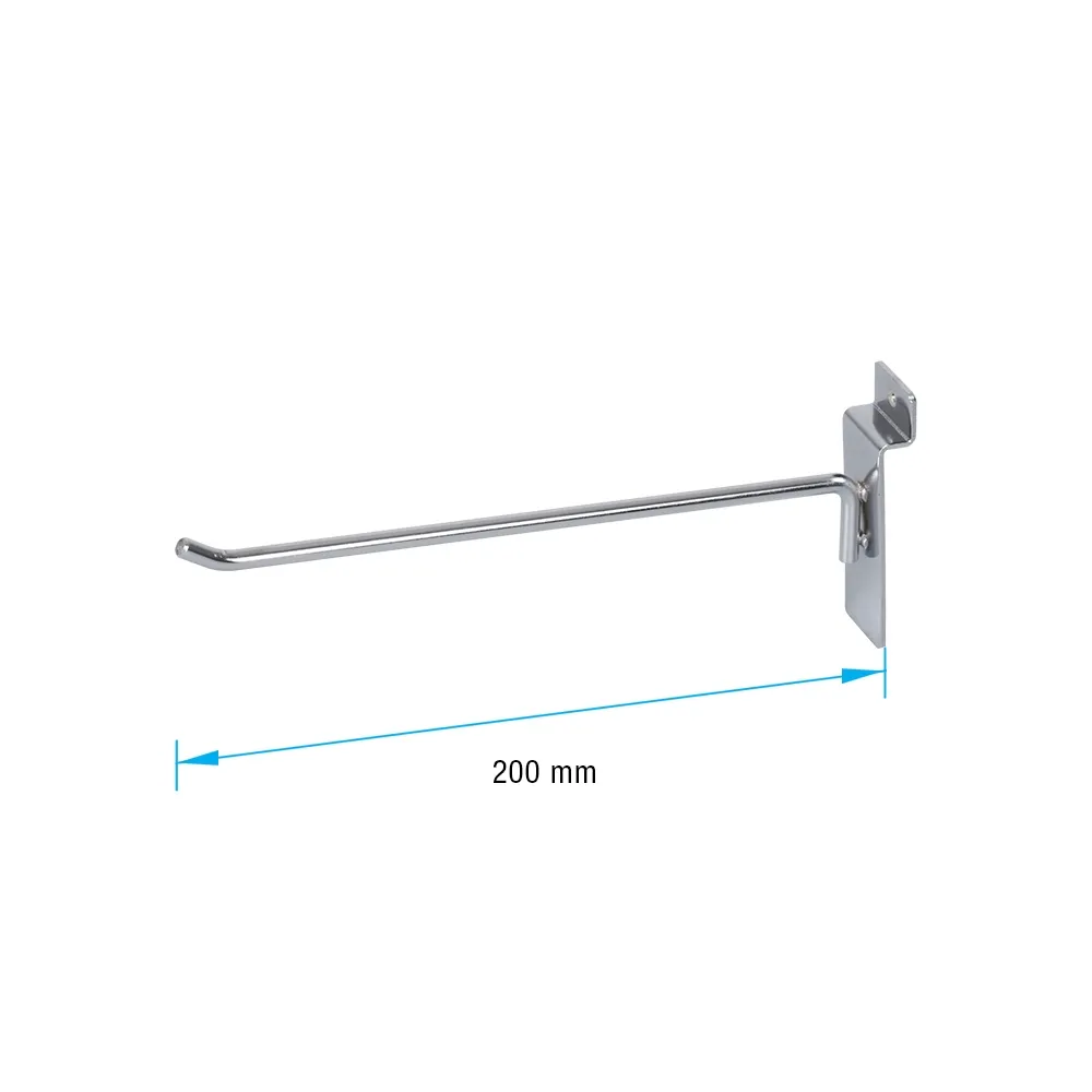 Slat panel hooks help you create the exact slat board fixture that will suit the needs of your location. Slat accessories enable you to hang products and valuable information on a slat board that will inform visitors and help customers making buying decisions. This hook is 200mm long to hold lots of stock. The end of the rod is curved, helping to ensure items don't easily slip off whilst on display at your business. The back of the hook has an indent to easily slide into a slatwall channel and moved into desired position.