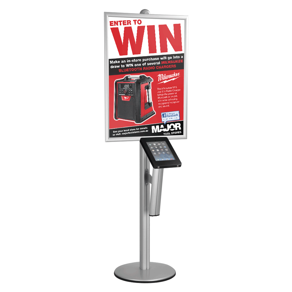 Modular iPad stands create an interactive experience for visitors at your next event, helping show them about your business or sign them up to be helped! The tablet enclosure is a locking display that is designed for Apple® iPad 7th (2019), 8th (2020), & 9th (2021) generations in portrait or landscape orientation The lockable design allows it tobe placed in public locations whilst deterring theft and tampering. A hexhead key is included to secure the table to the stand itself, making this stand perfect for retail stores, shopping centres, exhibition halls, doctor offices, museums, and more!