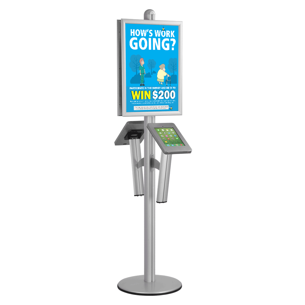This 2-sided iPad floor stand has snap frames that holds A2 (420 x 594mm) posters in portrait format. These snap frames require no tools for changing out graphics, and take less than 60 seconds to switch out! Each of the (2) poster holders include clear lenses that help keep dust and grime from gathering on posters during use and make it easier to clean whilst deterring vandalism directly to the graphics