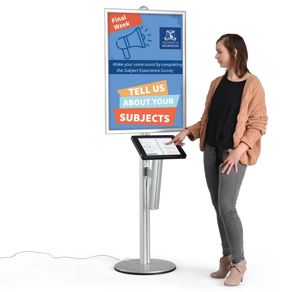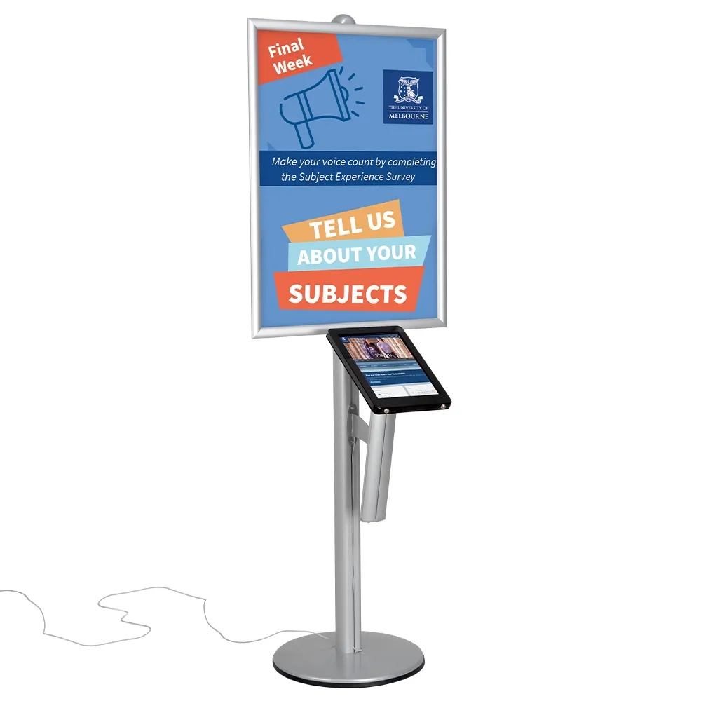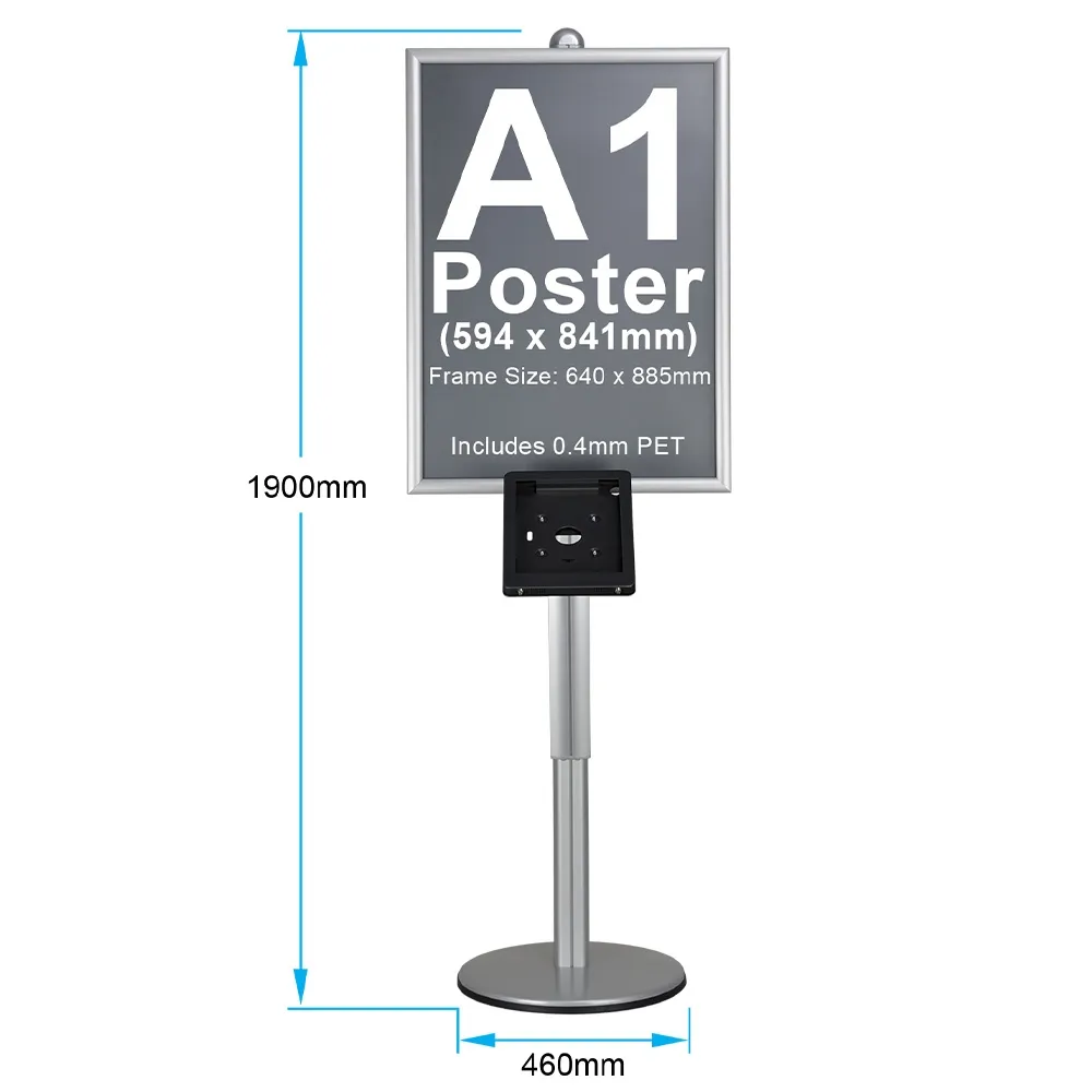 This iPad Pro 12.9 stand holder features an A1 (841 x 594mm) poster snap frame that slides along the centre pole to your desired position. The clip frame design makes poster changes quick and easy with no tools needed for quick changes. A protective lens is also provided that keeps posters looking clean and prevents grime build-up during display. The enclosures for iPads are modular units that have many display components available to fully customise the kiosk for your use!