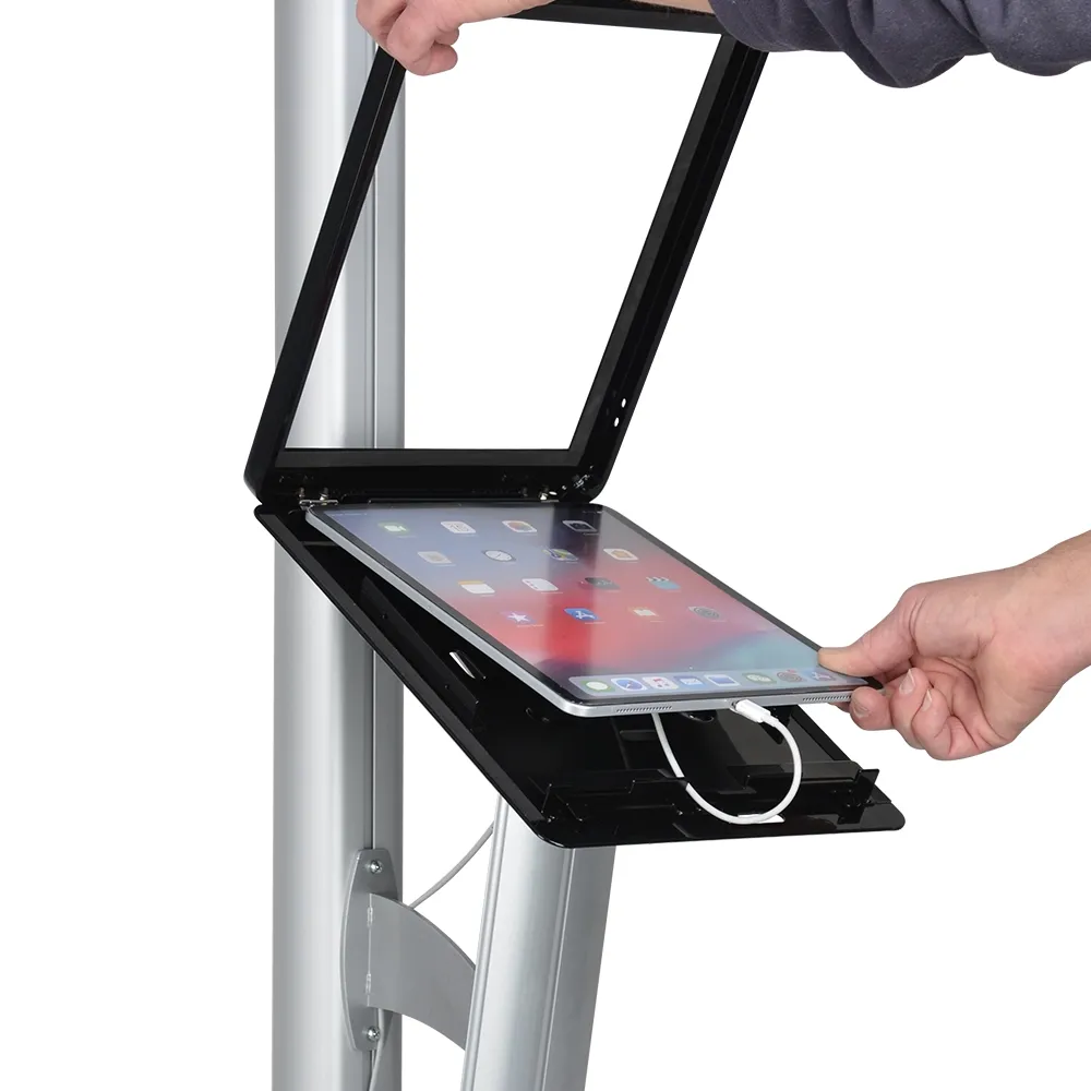 This Apple tablet floor stand, iPad Pro 12.9 stand holder is great for use as an information kiosk, combining a poster holder and tablet to draw in passersby and offer an interactive display for them to use. The locking tablet mount provides security in public spaces to help prevent theft, and is designed to hold Apple iPad Pro 12.9-inch in either portrait or landscape orientation depending on your need. There are cut-outs in the back for threading the charging cable to keep the unit powered, and internal cable management helps to ensure the display remains tidy whilst in use.