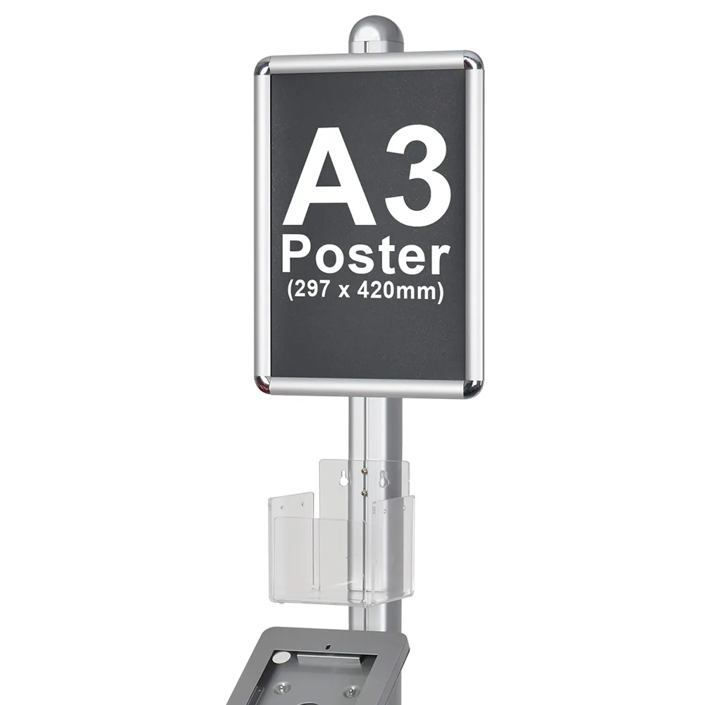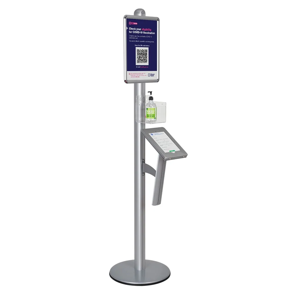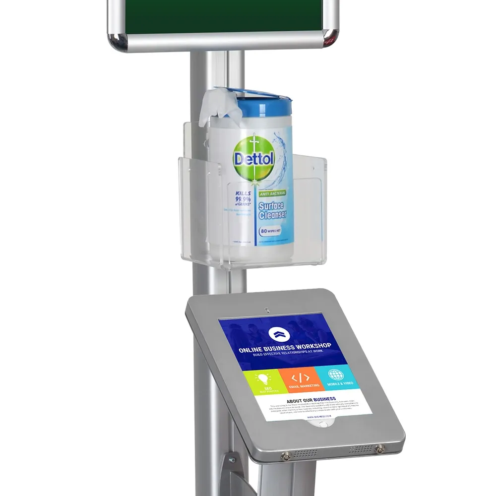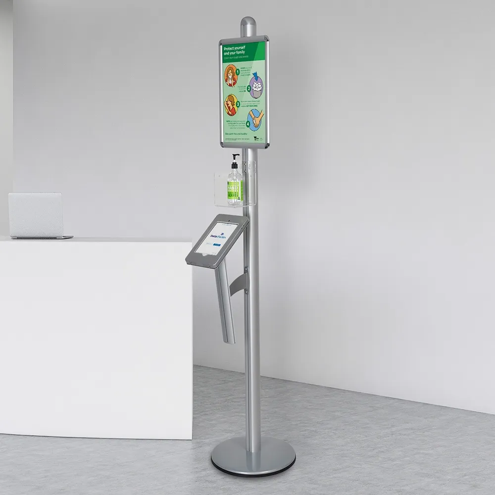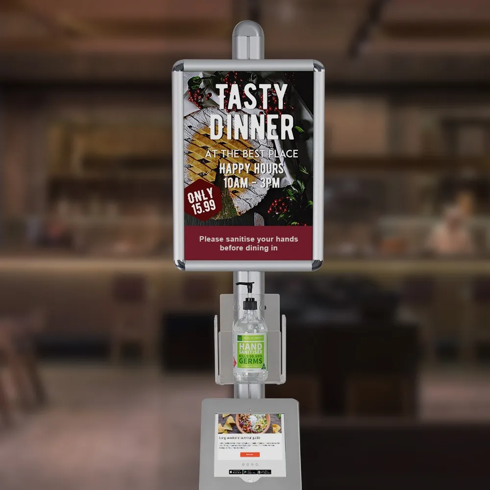 A hand sanitizer stand and dispenser can be placed at the entrance to your location to allow visitors to clean their hands and check-in for appointments, all in one convenient kiosk! The sanitising stations are also used as promotional stands, where the large A3 (297 x 420mm) poster frame can draw in passersby to then interact with the angled iPad to learn more about products, goods, services, or general information. The tablet holder is designed for Apple® iPad 2019 (7th Gen.),