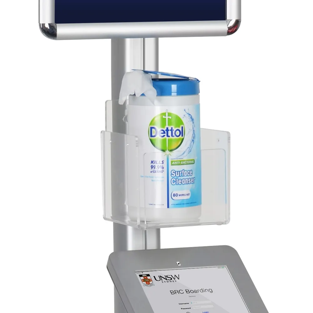 - Standalone iPad kiosk includes acrylic holder to offer anti-bacterial wipes or gel!